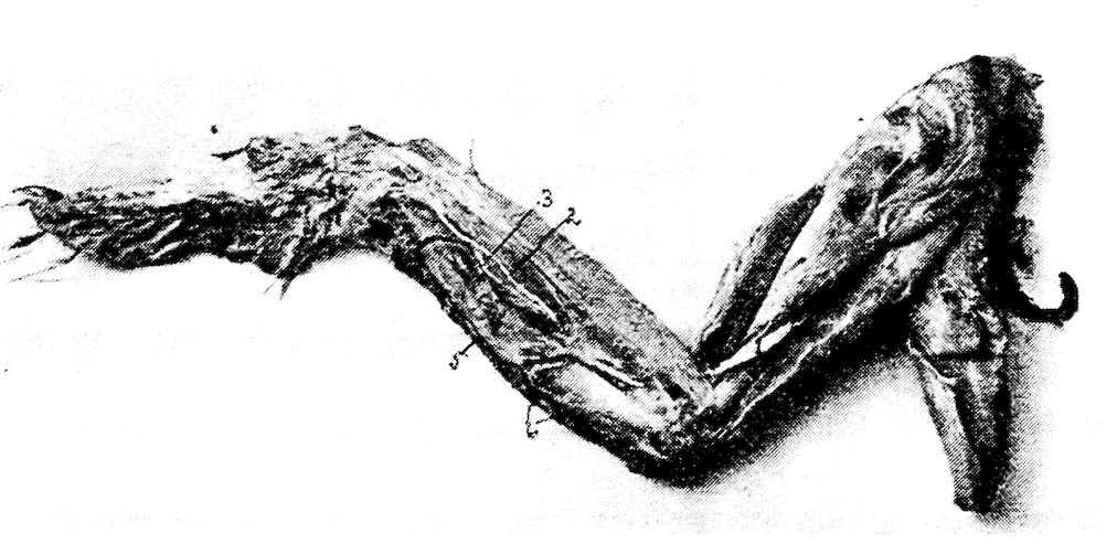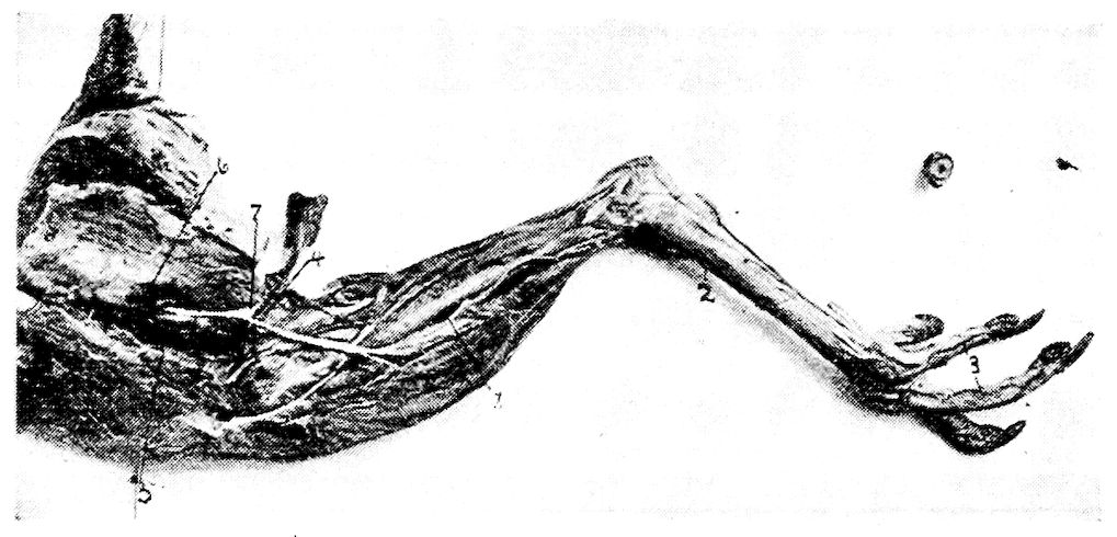 The arteries, the veins, and the nerves may now be dissected and studied in relation to one another and in relation to the muscles, the bones, and other structures. The skin should not be removed from the shanks till it is desired to dissect these parts, as the tissues quickly dry out. In fact, the tendons of the shanks and toes can best be dissected while the specimen is fresh.