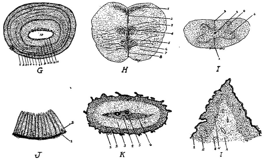 A Study of the Structure of Bones.—Longitudinal and transverse sections of old bone may be made by making thin longitudinal and transverse sections with the bone saw, and then by making them very thin with a fine three-cornered file. Examining under the low power microscope, we note the lacunæ, the canaliculi, and the Haversian system.