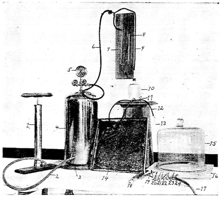 1, Pump. 2, Rubber tube leading from pump to compression chamber. 3, Stop cock. 4, Compression air tank. 5, Pressure indicator. 6, Rubber tube leading from pressure tank to manometer. 7, Top of mercury in manometer tube. 8, Open end of glass tube showing scale in centimeters. 9, Tube leading from 4 to injection chamber. 10, Injection chamber containing injection fluid. 11, Pinch cock on rubber tube connecting injection chamber with injection canula. 12, The tube. 13, Injection canula. 14, A metal dissection tray. 15, Death chamber. 16, Base of same. 17, Rubber tube connecting gas cock with death chamber. 18, Bone saw. 19, Bone cutter. 20, Scapula. 21, Tenaculum. 22, Forceps. 23, Straight scissors. 24, Small pair of curved scissors.