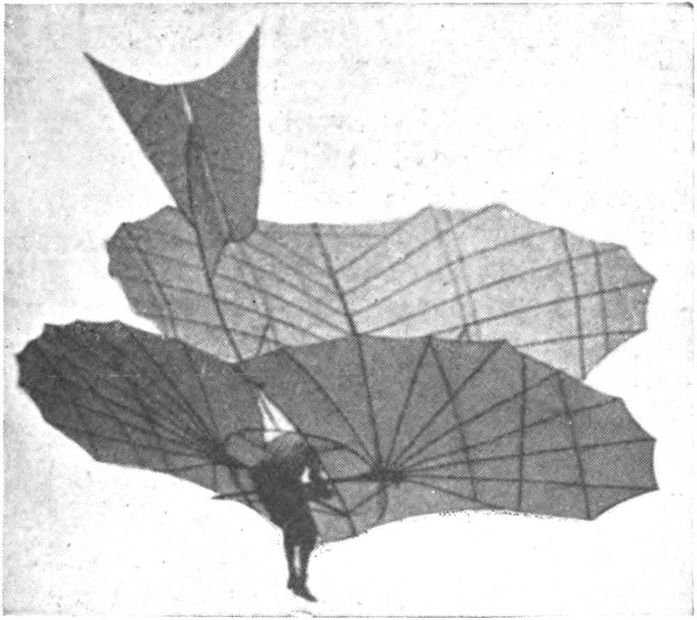 Lillienthal was the first man to accomplish successful flights through the air by the use of artificial wing surfaces. After many years of experiment and study of soaring birds he constructed rigid wings which he held to his shoulders and which, after he had gained considerable velocity by running forward downhill, would catch the air and lift[Pg 5] his weight completely off the ground. The wings were arched, for he observed this was the case in all birds; flat wings proved useless in flight, and suggested a reason for the failure of previous experimenters. To these rigid wings Lillienthal fastened a rigid tail; the wings and the tail comprised his “glider.” There were no control levers and the only way the operator could steer was to shift the balance by swinging his legs one way or the other.[Pg 6] Lillienthal constructed an artificial hill for his gliding so that he could coast downward for some distance without striking the ground and he was able to accomplish many glides of a couple of hundred yards in length.