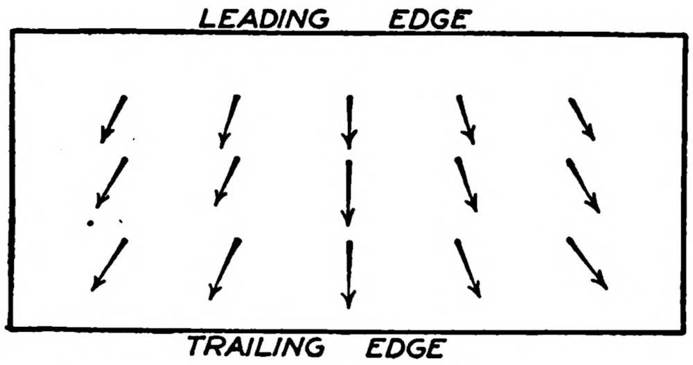 Lateral Control.—After satisfying themselves regarding fore and aft control, the Wrights took up lateral control. Their problem was to devise a means for keeping the span of the wings level so that when for any reason one wing tip should sink lower than the other, it could be at once raised back to its proper position. Lillienthal had tried to do this by swinging his legs toward the high side; the shifted weight restoring the position. The Wrights, to obviate this inadequate method, bethought themselves to restore equilibrium by means of the wind itself rather than by gravity. They observed an interesting maneuver employed by a pigeon which seemed to secure its lateral balance in exactly the way they wanted; this bird was seen to give its two wings each a different angle of attack, whereat one wing would lift more forcibly than the other, thereby rotating the bird bodily in any desired amount or direction about the line of flight as an axis. To copy this bird apparatus in a Wright glider, it was found sufficient to alter the angle of the wing tips only, leaving the chief part of the supporting surface in its original rigid position. In other words, the wing tips were to be warped; the one to present greater angle of attack, the other[Pg 10] less angle, exactly as in the case of the pigeon. Suppose the airplane to develop a list to the left, the wing on that side sinking, the pilot was to increase the angle at the tip of this left-hand wing by moving the warping lever, and at the same time decrease the angle of the right-hand wing by the same lever. He was to hold this position until the airplane was righted and brought back to level position.