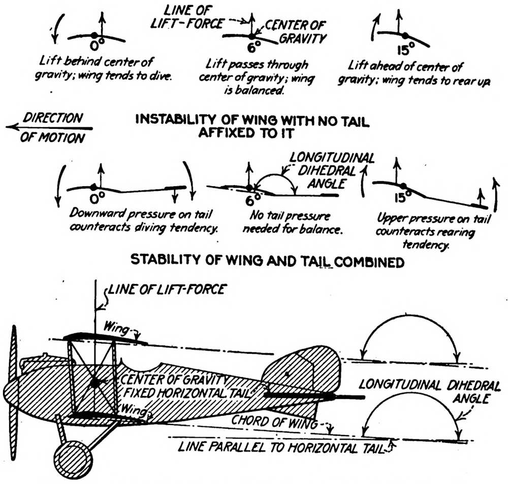 They set out, therefore, deliberately to solve the whole question of airplane stability. There was the fore and aft or horizontal stability, for which Lillienthal had swung his legs forward and backward; there was in addition the sidewise or lateral stability for which Lillienthal had swung his legs to left and right. The fundamental requirements to be met were that during flight the glider should be kept in its proper attitude without diving or rearing up, and without rolling into an attitude where one wing tip was higher than the other, i.e., the machine was to be kept level in both directions.