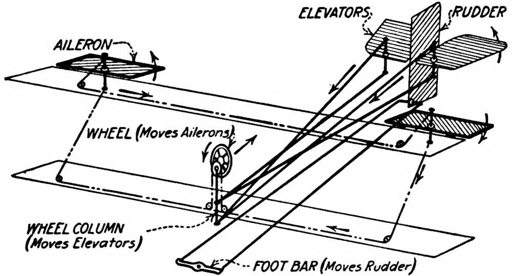 Fore and Aft Control.—After some preliminary trials the Wrights found that the fore and aft balance could be controlled by an elevator or horizontal rudder, supported on outriggers on the front of the airplane, and operated by a lever. If the pilot found the glider pitching too much downward, and tending toward a dive, he would tilt the elevator upward by moving the lever, thus turning the glider back into its proper attitude. This elevator in modern machines is back of the airplane, [Pg 9]a better place for it than was chosen by the Wrights. It may be said that their chief reason for first putting it in front was that they could see it there and observe its effect. They soon realized that the rear location gave easier control, and they acted accordingly.