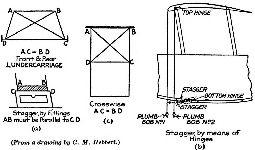 Weekly Inspection.—Check over all dimensions, span, chord, gap, stagger of wings, angles of incidence or set angle of wings and tail, dihedral angle, alignment of fuselage, rudder, elevators, and the general truth of the machine.
