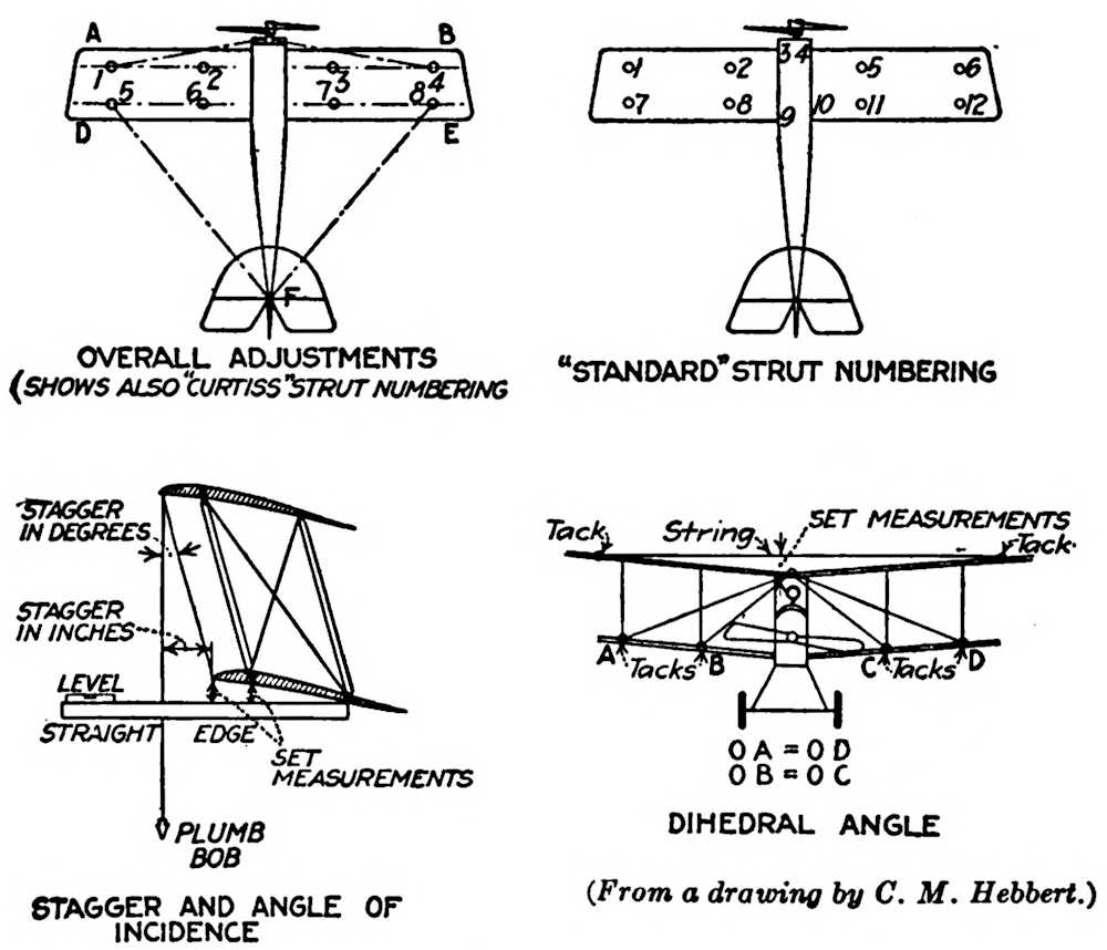 Verify the angles of incidence, the dihedral angle, the stagger, and the overall measurements as often as possible (at least once a week) and correct as outlined in notes on assembly and adjustment of airplanes.