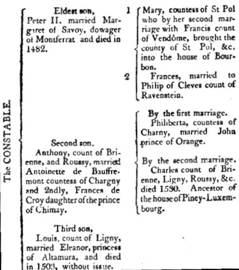 Besides these three sons, who were temporal princes, the constable had two others, John his eldest, who was called count of Marle and Soissons, and killed at the battle of Morat, in the life-time of his father, and Charles bishop of Laon who died in 1509. His daughters were Jacqueline the wife of Philip de Croy, count of Porcien, Helen the wife of Janus of Savoy count of Geneva, Philippa abbess of Moncel, and Jane a nun. Of all these children, Louis and Jane were the offspring of his second marriage with Mary of Savoy, the sister of Margaret the[Pg 445] wife of his eldest surviving son Peter. The constable had besides, a numerous illegitimate progeny—John bishop of Angouleme, Jane married to Anthony d'Ailly lord of Varennes, Margaret the wife of Philip d'Inchy castellan of Douay, &c. &c.