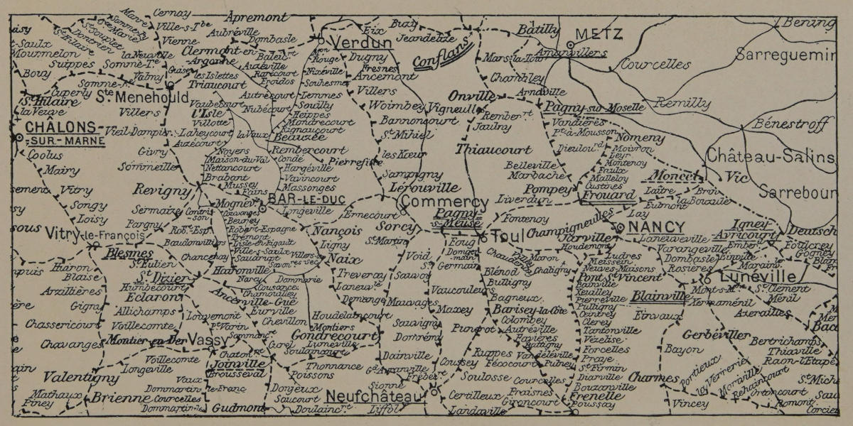 [4] Verdun, the Virdunum of the Romans. In the third century a bishopric was founded there with Saint Saintin as first bishop; 843, the treaty of Verdun; after the battle of Fontanet the three sons of Louis the Debonair, Lothair, Louis of Bavaria, and Charles the Bald, divided the empire of Charlemagne, with the result that not only was France separated from Germania, but her natural boundaries, the Alps and the Rhine, were lost; 1792, the Prussians besieged it in force and it was obliged to capitulate after two days; 1870, a heroic defense lasting nearly three months ending in capitulation; 1916, Ils n’ont pas passé, ils ne passeront pas.