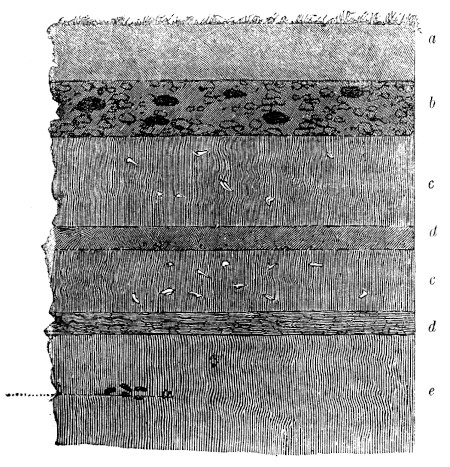 Il Prof. Stoppani di Milano, in una dotta sua memoria publicata nel Politecnico (vol. XXIII.), ha cercato invece spiegarne l’origine per la diretta combinazione de’ loro elementi sotto l’influenza delle forze vulcaniche. Io non mi farò qui a discutere se l’associazione delle surgenti di gas infiammabile e di petrolio colle salze, e di queste co’ vulcani veri, sia intima e causale, più che fortuita. Mi pare che la cosa non sia per anco sufficientemente dimostrata, sebbene i fatti addotti dal prof. Stoppani siano di molto peso, e ricevano l’appoggio dell’incontestabile autorità del sig. Abich, il quale ha trovato nella disposizione de’ vulcani di fango e delle sorgenti bituminose della penisola di Apscheron uno stretto rapporto colle linee di dislocazione dovuta alle emersioni trachitiche (Mem. dell’Acad. Imp. di Pietroburgo, tomo VI, 1863).