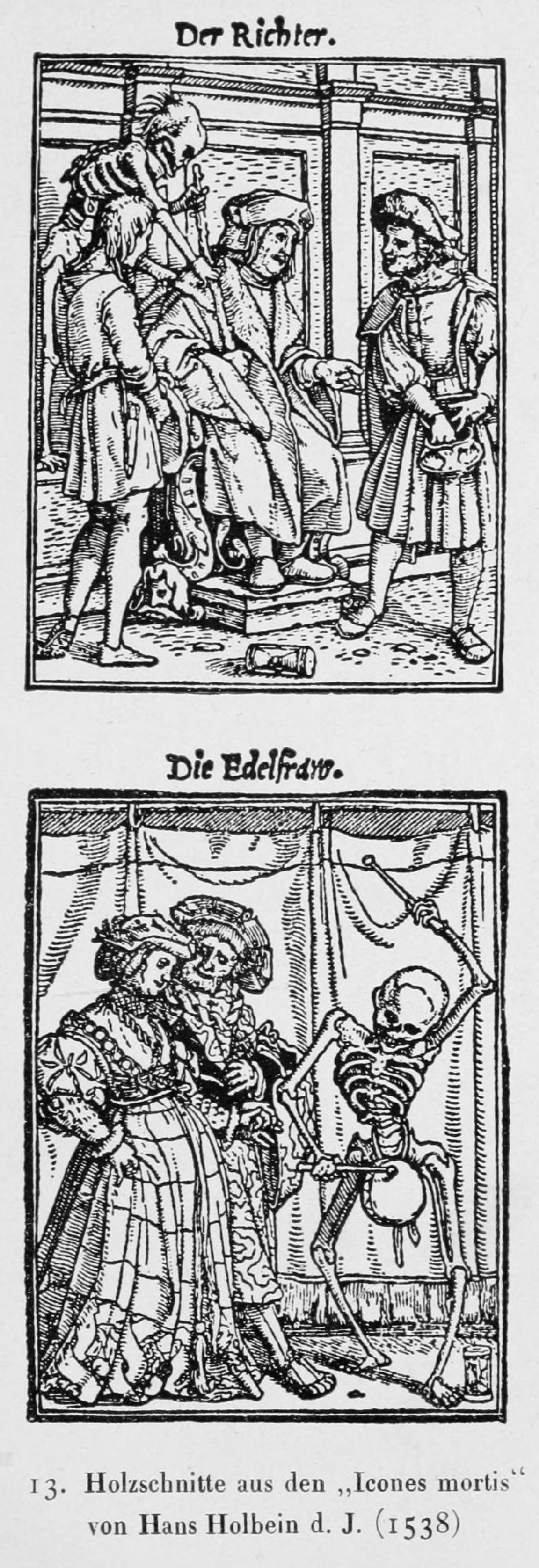 Doch die Trennung des Reigens in einzelne Paare von je einem Lebenden und einem Toten, welche unter äußerem Zwang in den Blockbüchern vorgenommen wurde, mußte die Auffassung verstärken, daß es sich bei dem Skelett um den personifizierten Tod handle. Holbein d. J. zieht zum erstenmal die künstlerischen Konsequenzen daraus. Er, der in humanistischer Luft aufgewachsen war, geht von der antiken Vorstellung des persönlichen Todes aus, welcher alles ohne Unterschied dahinrafft, und gibt dementsprechend einzelne[S. 9] Bilder, auf denen der Tod den jeweiligen menschlichen Standesvertreter mitten aus seiner Beschäftigung herausreißt. Auch bei ihm halten doppelte Skelette noch die Erinnerung an die Uranschauung vom Tanz der Toten fest. Sonst ist der Tanz fast ganz verschwunden; nur ein Musikinstrument in der Hand des Todes erinnert manchmal daran. In dieser Umbiegung und Wandlung des Motivs spricht sich aber auch eine gänzlich veränderte Grundstimmung aus, der Individualismus des Renaissancemenschen, welcher dem kollektivistischen Mittelalter gegenübertritt und es ablöst.