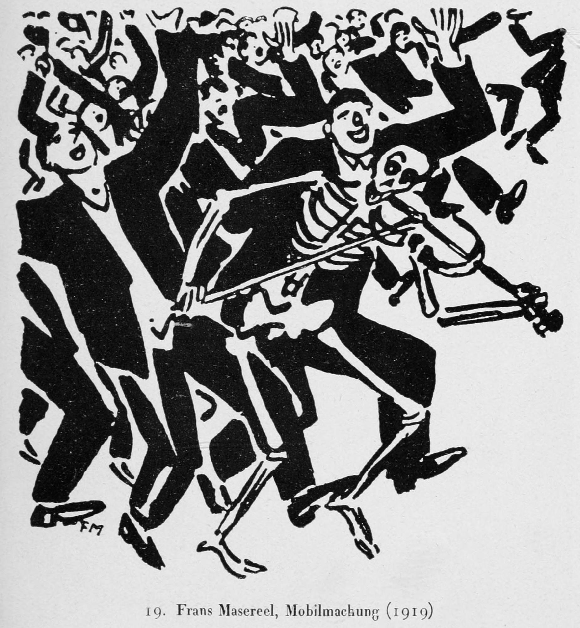 Holbeins Auffassung ist herrschend geblieben bis heute; sie hat die vielen Totentänze allenthalben beeinflußt. Genau wie Holbein den Tod handelnd in das Leben seiner Gegenwart hineinstellte, tun es auch die Späteren. Sowohl die mehr oder weniger geschickten Kopisten (wie im Bischofspalast zu Chur oder in der Handschrift zu Donaueschingen) als auch die selbständigeren Nachahmer, besonders der Barock- und Rokokozeit (Füssen, Erfurt, Chodowiecki), als auch die eigenschaffenden Künstler des 19. Jahrhunderts und der Gegenwart. In bald humorvollen, bald ernsten Zeichnungen mahnt z. B. bei Pocci der Tod. Auf Rethels Holzschnitten agitiert der Tod für die Revolution, er geigt auf dem grausigen Maskenball der Pest zum Tanz, er wallt als ernster, friedebringender Pilger durch die Lande. Auch Böcklin, von Holbeins Tuke-Porträt berührt, hörte von der letzten Saite der Todesfiedel den Tod schwirren. Das gewaltige Erlebnis des Weltkrieges hat mehr denn je gerade das Motiv des Totentanzes[S. 10] den Künstlern und Dichtern wieder vor die Seele gerückt. Hier taucht vielfach die Uranschauung wieder empor, daß das Heer der Toten aus den Gräbern steigt und die Lebenden in seine Reihen zwingt. Damit ist der alte Ausgangspunkt wieder erreicht, der Kreis geschlossen, in welchem Mensch und Mensch sich begegnen.