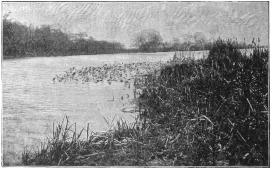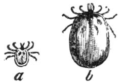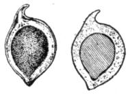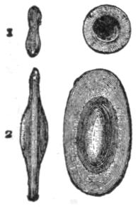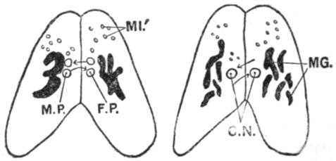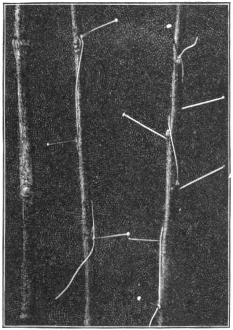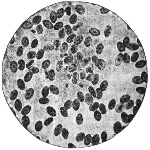 Mosquito Fevers.—Malaria, yellow fever, and probably dengue are transmitted each by a different genus of mosquito (Fig. 132). A mosquito of the malarial genus may bite a patient and suck into its body blood-corpuscles containing spores of the malarial parasite (a protozoan animal, see “Animal Biology,” p. 7). Afterwards a spore (in another stage) may be transmitted by this mosquito when it bites another person. The germ enters a red corpuscle, grows, and finally divides into many little spores. At this moment the corpuscle itself breaks up, setting free in the blood the spores and toxin formed. This causes the chill and fever. This development usually takes forty-eight hours, hence the fever occurs every other day. These mosquitoes begin to fly at dusk. How are they recognized? (Fig. 132.) They should be kept out of houses by screens or from the beds by netting. Kerosene should be poured on breeding places at the rate of one ounce for fifteen square feet of standing water. This should be repeated twice a month. Cactus macerated in water may be used, and forms a permanent film on the water. Stagnant pools may be filled or drained (Exp. 4). Malarial patients should themselves be screened, as the chief source of danger to others; for only mosquitoes who suck the blood of malarial patients will transmit the disease. Even then it is only transmitted to those whose white blood corpuscles are unable to protect them (Fig. 133).