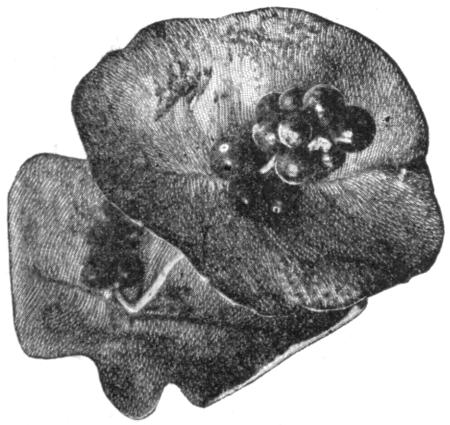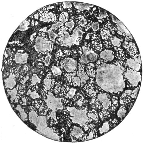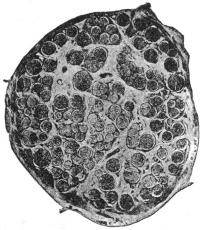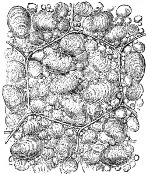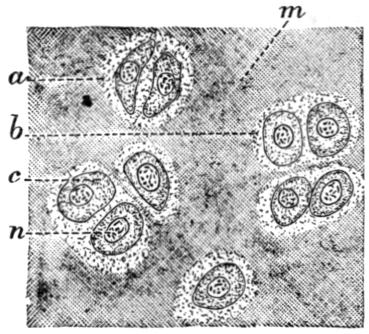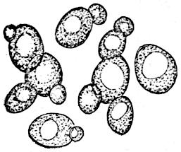 Fig. 129.—Yeast Cells magnified 200 diameters, or 40,000 areas. Yeast plants multiply by budding. Notice small cells growing on larger and older ones.