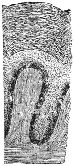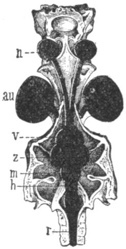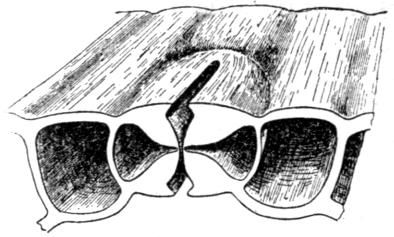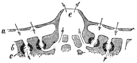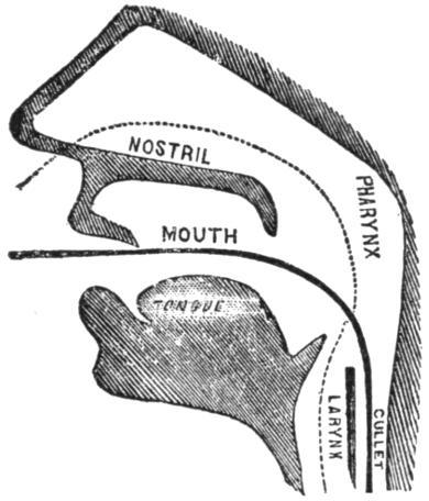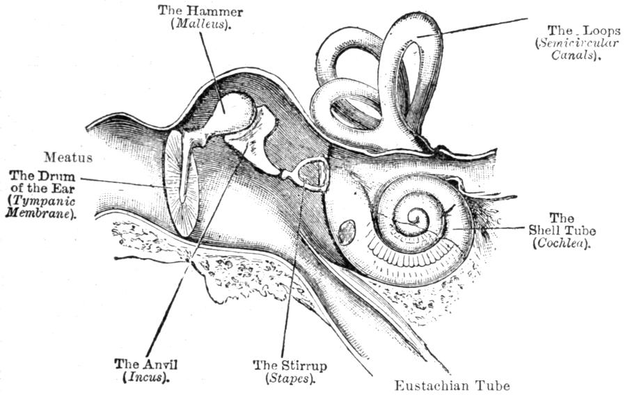 A cold in the head or a sore throat may extend through this tube to the middle ear and affect the hearing. This occurs because the tube is closed by congestion of its lining; the air of the middle ear may be partly absorbed, and the pressure of the outside air may cause the drum[H 157] membrane to bulge inward, and to be stretched so tight that it cannot vibrate freely.