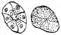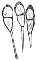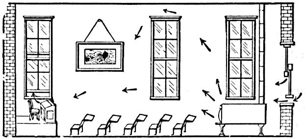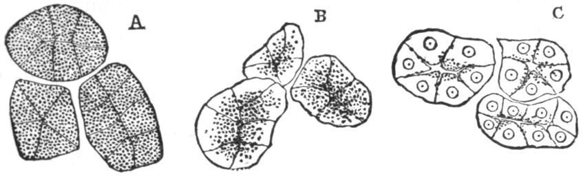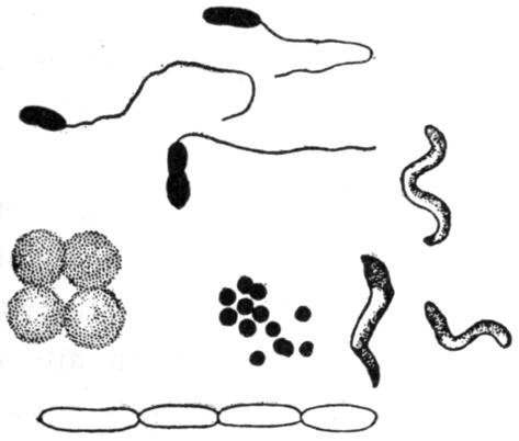 Multiplication of Bacteria.—This is by division or fission. Sometimes, instead of dividing, a little rounded mass known as a spore appears. The spore breaks out and the bacterium itself perishes. Species which do not produce spores are readily destroyed, but spores have a hard, tough shell, and they may be dried or heated even to boiling without being killed. Spores float through the air and start new colonies. Most common bacteria grow best between 70° and 95° F. They render it difficult to preserve foods, especially proteid foods (cheese, lean meat, eggs, etc.). Food decays slowly if at all below 70° and above 125°. Direct sunlight, or the temperature of boiling water (212° F.) kills bacteria but not spores. Pantries, kitchen, and sickrooms should have bright walls and all the light possible. Boiling water should be poured into the sink, and dish cloths should be thoroughly washed in boiling water.