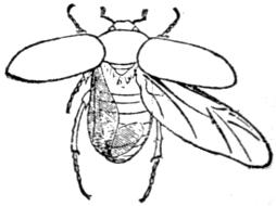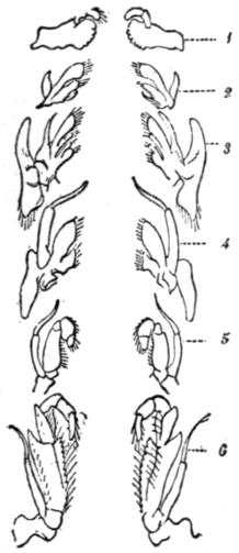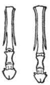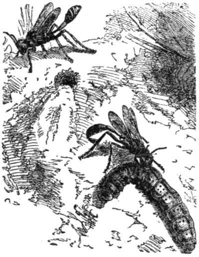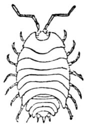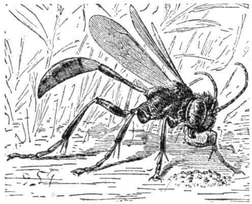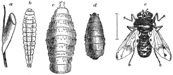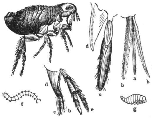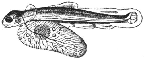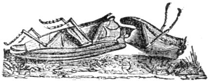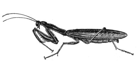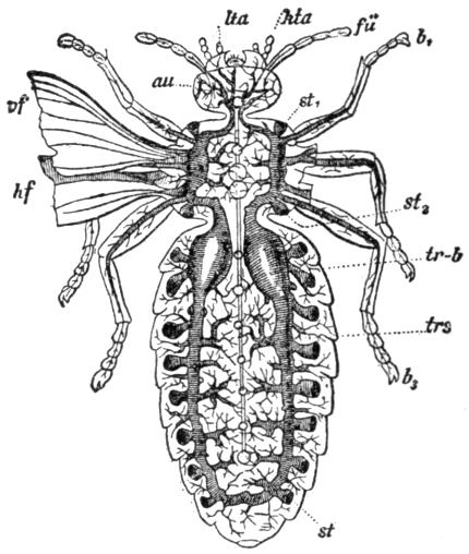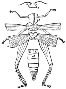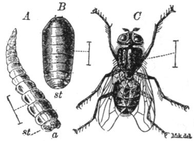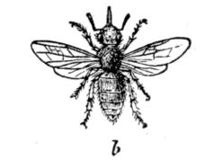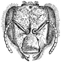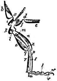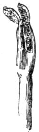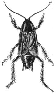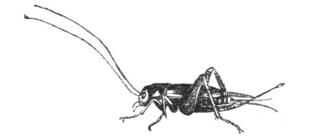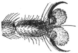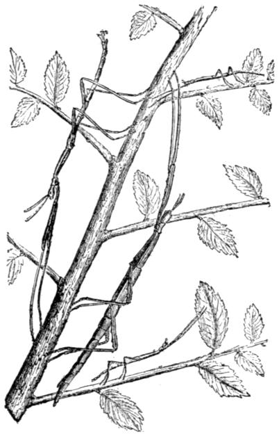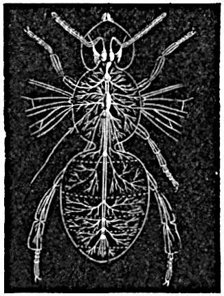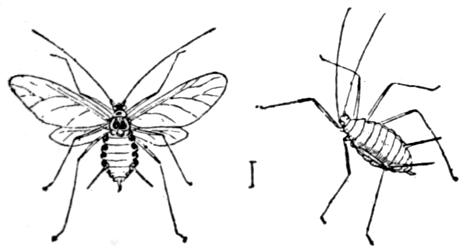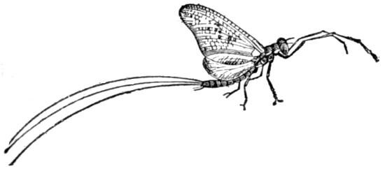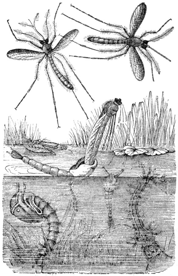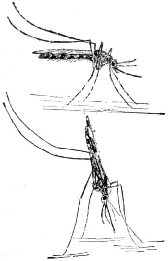 Fig. 132.—Culex or Common Mosquito, above (possibly carries dengue fever). Anopheles or Malarial Mosquito, below (not always infected). Body of malarial mosquito is never held parallel to the supporting surface (unless a leg is missing); it has five long appendages to the head, the culex (above) has only three. (Draw.)