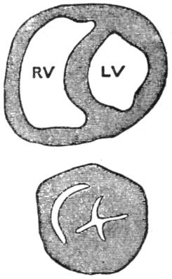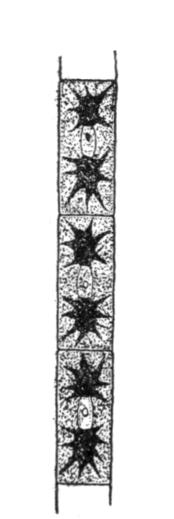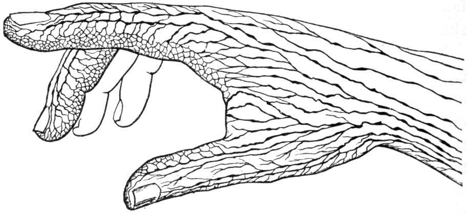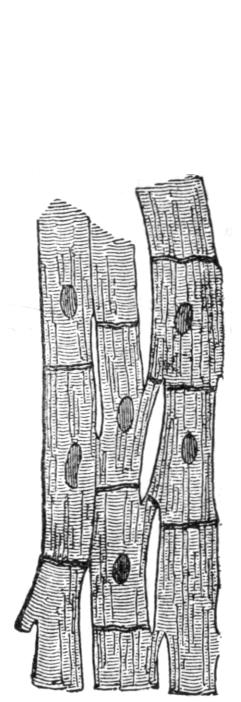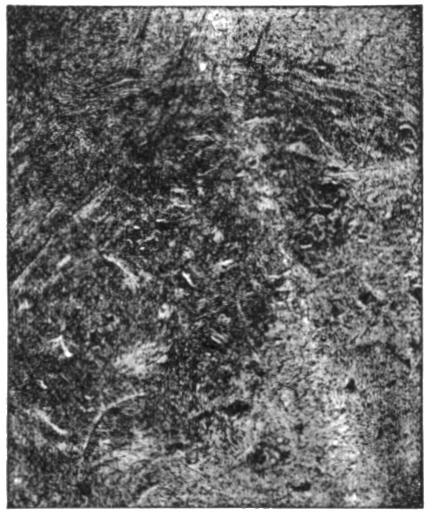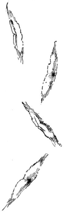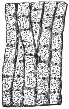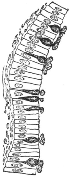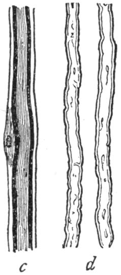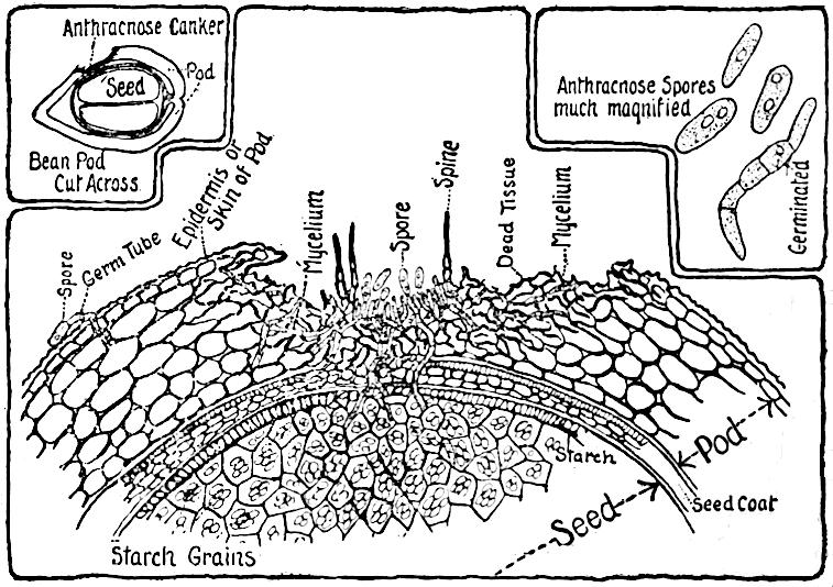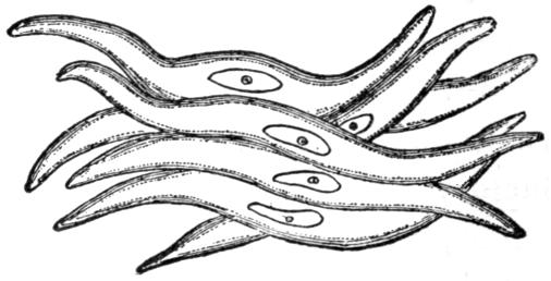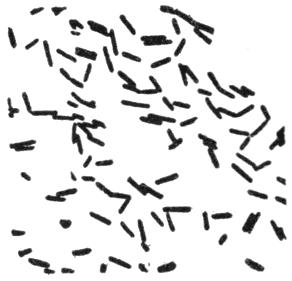 Diseases due to Bacteria.—A germ disease is usually due partly or wholly to substances called toxins produced by the bacteria. Most disease germs attack a single organ[H 160] of the body. Diphtheria is caused by a species (Fig. 130) that grows on the mucous membrane of the throat; this germ produces a powerful toxin. The germs of typhoid fever (Fig. 131) and Asiatic cholera multiply in the small intestine. In both these diseases the source of infection is the diarrhœal discharges from the alimentary canal. Flies may carry the germs on their feet from the discharge to food. Sometimes typhoid fever cases occur throughout a town because the water supply has become contaminated by sewage. Cases may occur only in families that buy milk from a certain dairy, because the milk cans have been washed in contaminated water. In caring for a typhoid patient all suspicious material should be disinfected or burned. Germs of tuberculosis (called consumption if the disease is in the lungs) may float through the air. Recent investigations indicate, however, that infection usually occurs through the alimentary canal, the germs being swallowed, then absorbed and taken to the lungs in the blood or lymph. To prevent a patient from reinfecting himself in new parts of the lungs or elsewhere, he should carefully cleanse his teeth, mouth, and throat (by gargling with formal or lysol) before eating.