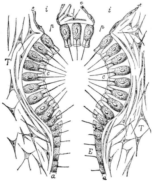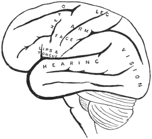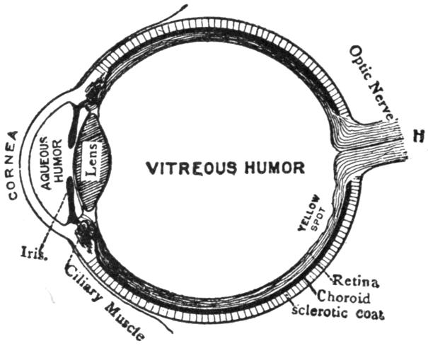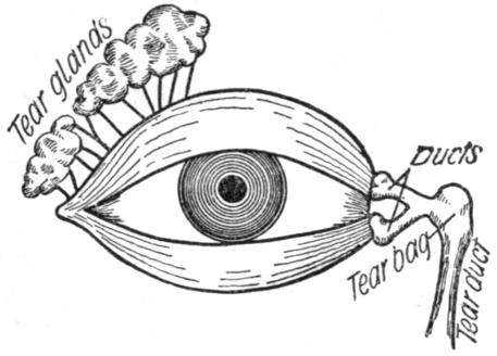 The external ear consists of a large wrinkled cartilage on the exterior of the head and a canal leading from it, called the meatus. This passage is closed at its inner end by the drum membrane or drum skin. It is often called the drum, but this name is properly applied to the whole middle ear. A trial will show that the drum skin cannot be seen even with the aid of a bright light, for the passage is slightly curved (see Fig. 128). Hence a missile or a flying insect cannot go straight against the ear drum. The skin lining this passage contains wax glands, which secrete a bitter sticky wax, which helps to keep the passage flexible. This wax catches dust and usually stops insects that may enter. If an insect enters the ear, it may often be coaxed out by a bright light held close to the ear. The ear wax in a healthy ear dries with dust and scales of epidermis and falls out in flakes, thus cleansing the ear. It[H 156] is unwise to probe into the ear with a hard object or even with the corner of a towel. It is not necessary to insert the finger in the meatus to cleanse it; it is one inch long, but only about one fourth inch across. (How large is the little finger?) The cartilaginous ears on the sides of the head should be carefully washed because of their many crevices. If ear wax is deposited too fast, it will cause temporary deafness and earache. It may be syringed out with warm water. Earache is usually caused by a small boil which requires time to relieve itself by bursting. Warm water poured into the upturned ear, or hot flannels or compresses applied to the side of the head will lessen the suffering. Each ear has three muscles for moving it. Once they were doubtless useful to all, but like the scalp muscle they have become so weakened by disuse as to be useless to most people. They are vestigial organs.