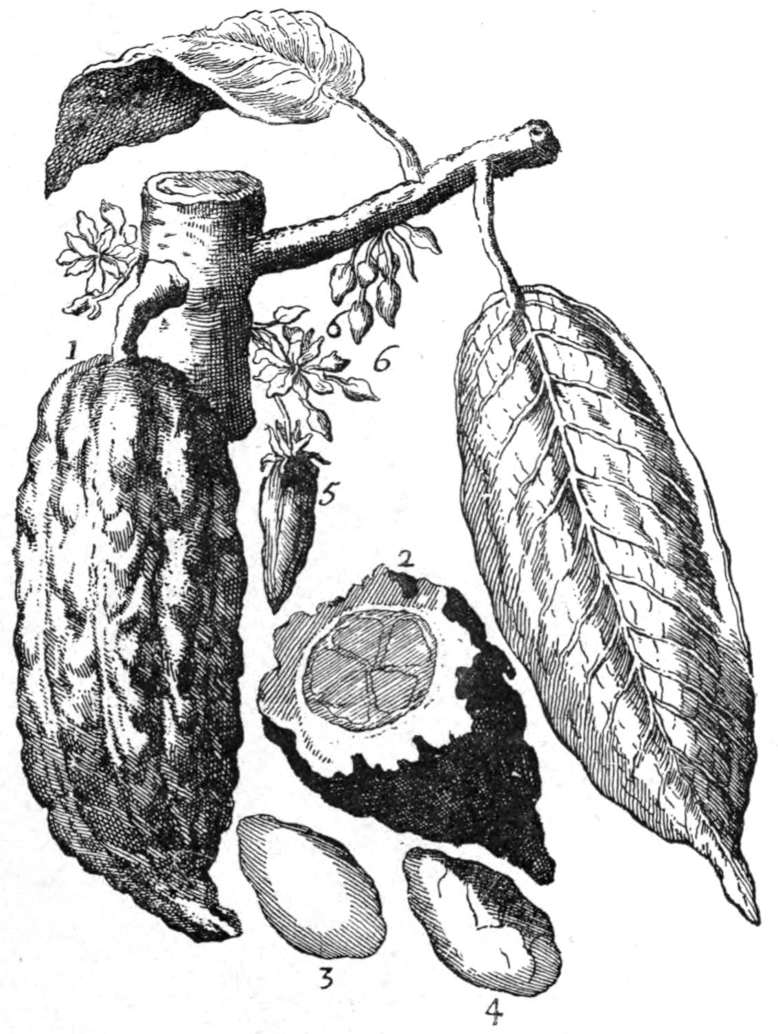The seeds of the plant are borne in pods, represented in the illustrations on pages 17 and 18, the former taken from one of the early works on the subject. No. 1 in the first engraving exhibits the ripened pod, 5 and 6 the fruits in different stages of growth. No. 2 shows the pod cut open and displays some of the seeds, while 3 and 4 are the seeds themselves,—the former in its natural state, the latter with the seed-coats removed.