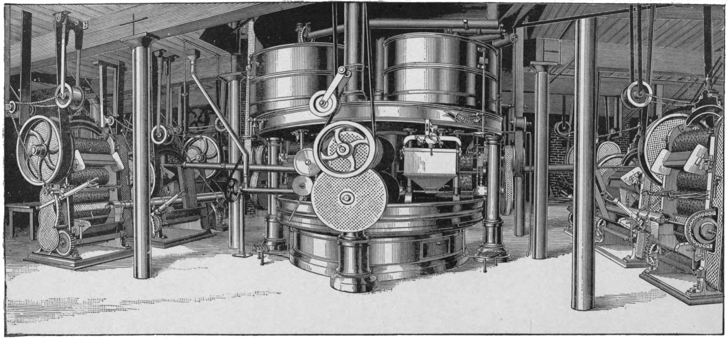 The variations in the process are innumerable, but all of them are comparatively unimportant when taken singly; the skill in the manufacture requires that each of these slight changes should be made at just the right time and in the right way. In the manufacture of Walter Baker and Co.’s chocolate, this skill has become developed to a very high degree during the hundred years of success. That the firm is ready to avail itself of every appliance known in modern manufacture, is seen by their adoption of the complicated machinery illustrated on page 29. This chocolate-machine has a capacity of five tons of pure chocolate daily. It is accessible to visitors, who may apply at the office in Dorchester for permission to see it in operation.