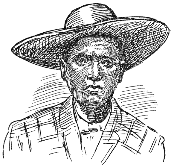 De oudste was kort van gestalte, doch had in zijn loopen iets bijzonder lenigs. Zijn gelaatskleur was koffiebruin; zijn kortgeknipt haar blauwachtig zwart. Zijn voorhoofd was reeds gerimpeld, maar zijn oogen glinsterden nog als gitten, terwijl, als hij sprak, twee rijen parelwitte tanden tusschen de breed-geteekende lippen te voorschijn kwamen. Hij droeg een gewonen Europeeschen, breedgeranden, vilten hoed van zilvergrijze kleur en, hoewel het in de heetste dagen van Augustus was, een met wol gevoerde demi-saison. Onder dit kleedingstuk had hij een soort van kort buis, waaronder een veelkleurige voorschoot tot op zijn knieën afhing. Om zijn middel droeg hij voorts een kleurigen, geplooiden doek, waarover een smalle, platte band, die met gespen was aangehaald.
