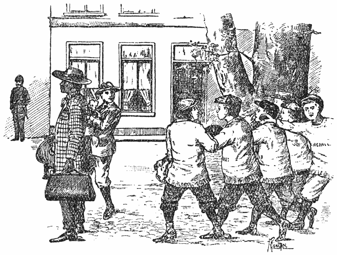 Vooral de laatste omstandigheid gaf aanleiding, dat de jongens weldra hun eerste schuchterheid op zij zetten en als echte brutaaltjes vlak naast de vreemdelingen gingen loopen. Het duurde niet lang of ook andere jongens, die niet tot „Achilles” behoorden, kwamen hun verwarde gelederen versterken, en in het gevoel, dat zij nu door hun groot aantal overmachtig waren, meenden zij het recht te hebben daarenboven ook nog overmoedig te mogen zijn.