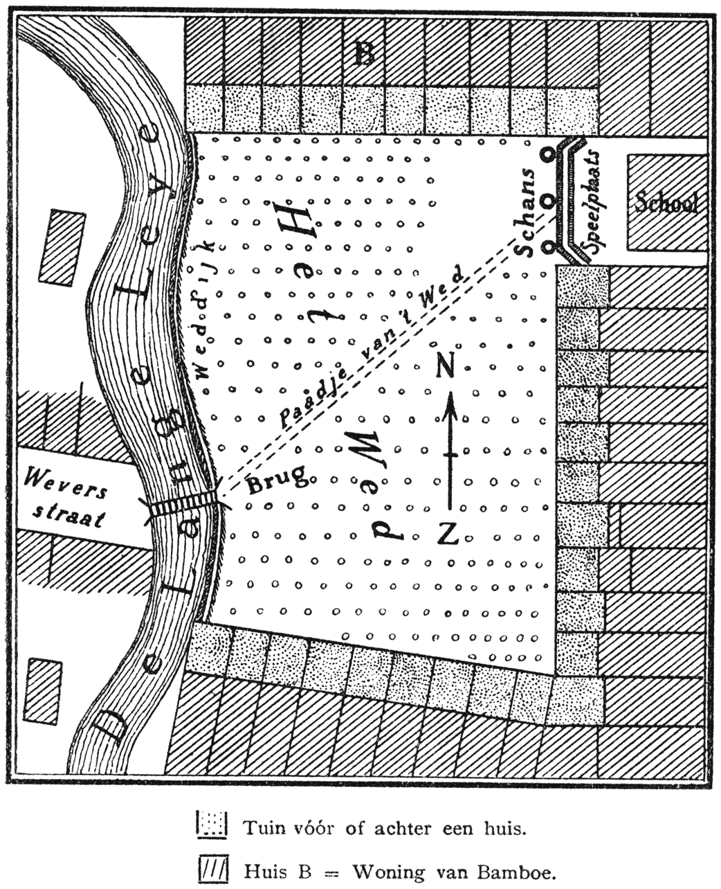 In een oogenblik hadden nu de brutale jongeheeren van „Achilles” den aftocht geblazen, behalve Rudolf van Dintelburg, die, evenals in de voetbal-club, ook bij de politie een schreefje vóór scheen te hebben en de vrijheid nam, zij het dan ook op wat bescheidener afstand, de beide reizigers te blijven volgen. Hij zag, hoe ze langs het Wed gingen en eindelijk stil bleven staan voor een onbewoond huis, kort bij de „school van Selhof”, welk huis de oudste vreemdeling met een sleutel opende. [8]