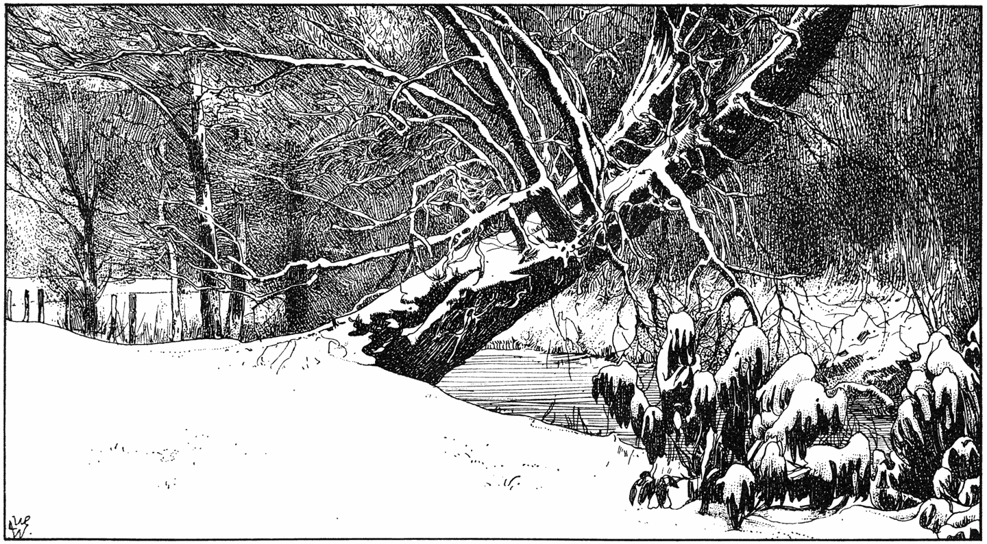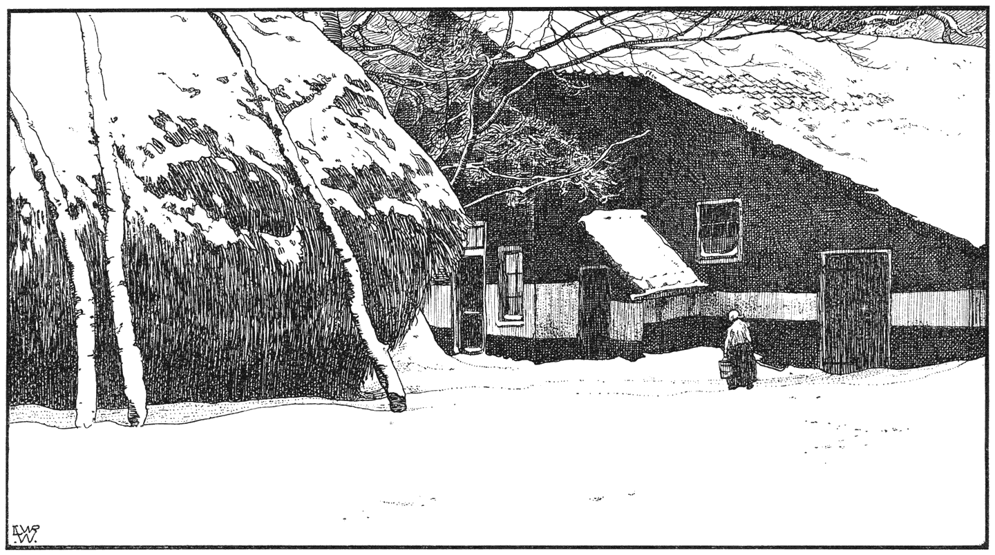 e winter begint, wanneer Manus het dak schoonveegt en dat is na den eersten Novemberstorm van beteekenis. Gedurende de heele Octobermaand zijn er ook wel bladeren van de boomen gevallen, doch niet zooveel opeens, dat de pannen vervuilden of de goten verstopt raakten. Nu echter komt alles tegelijk los. De boomen, die eerst nog, ondanks de geleden verliezen, goed in ’t blad zaten, staan daar nu opeens kaal en doorzichtig en weg en bosch ligt duimdiep onder de bonte afgevallen bladeren. Alleen het jonge eikenhakhout, dat op beschutte plaatsen groeit en de dikwerf gesnoeide beukenhagen (100) behouden het afgestorven blad, dat, bruin en droog, de heelen winter door, bij ieder windje kouwelijk ritselt.