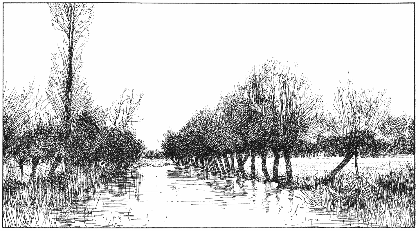 Het bladerlooze jaargetijde, de winter, is begonnen. De gevallen bladeren zijn als een voorbode van de sneeuwbuien, die nu gaan volgen. Wij kinderen dreven indertijd de gelijkenis wel zoover, dat we na zulke stormen in en met de afgevallen bladeren speelden als met sneeuw. Wij gooiden er mee, begroeven elkander erin en bovenal leek het een groot genot om een kwartier ver langs den straatweg te loopen, aldoor met de klompen, bij wijze van sneeuwploeg, schuivend in de dikke bladerenlaag. Van herfstweemoed en wintervrees hadden wij geen begrip. Alleen duurde het ons wat lang [6]eer de eigenlijke winter met sneeuw en ijs kwam. Je haalt dan in ’t begin van November, als voor ’t eerst de plassen op straat bevriezen, je schaatsen uit ’t vet, maar dan duurt het nog wel een week of acht, voordat er ernstig aan rijden gedacht kan worden.