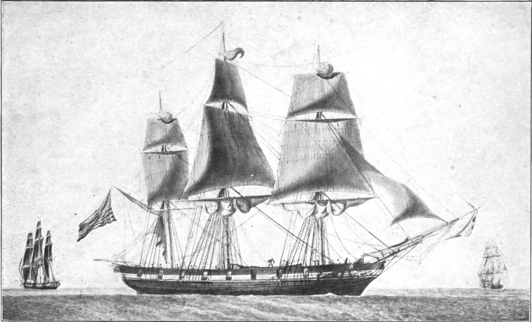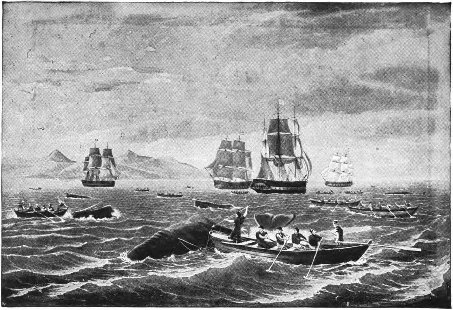 From an engraving by J. Hill after a painting by T. Birch. The picture shows the famous Roach (Rotch) whaling fleet,—the Enterprise, Wm. Roach, Pocahontas and Houqua, all from Nantucket. |