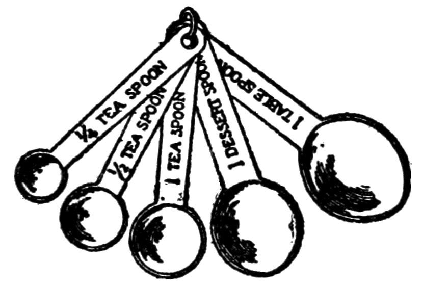 I wish to emphasize the absolute necessity for accurate measuring; to be a successful mixer of drinks, one must measure as carefully as one should when cooking. I use the measures I have in my kitchen, and have used them in making these recipes. Surely one has a quart cup, a half pint, or one cup, measure and a set of spoons; the tablespoon, dessertspoon, teaspoon and half teaspoon. Some sets have the quarter-teaspoon too. These sets, made of aluminum, may be purchased in any hardware store, or in the housekeeping department in the large shops at very reasonable prices. The glass cup is marked for quarter, half and three-quarters on one side, while on the reverse the marking is for one-third and two-thirds. The quart cup is marked for quarter, half and three-quarters; each quarter being equal to one cupful.
