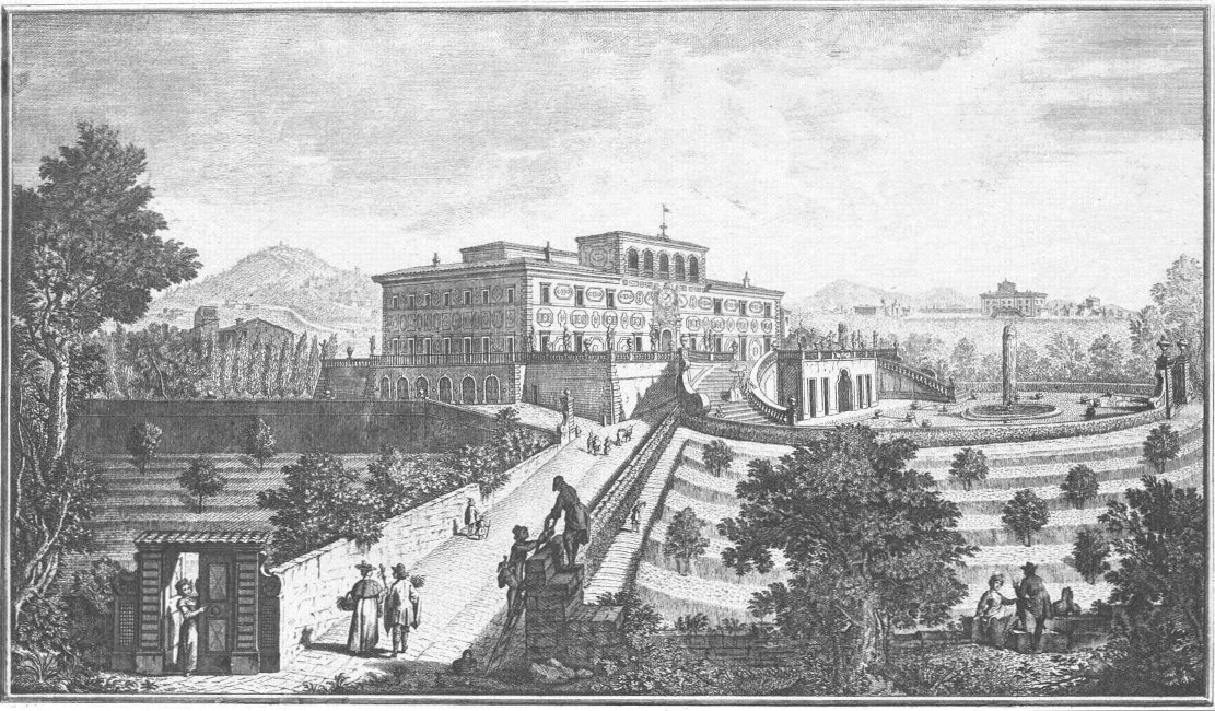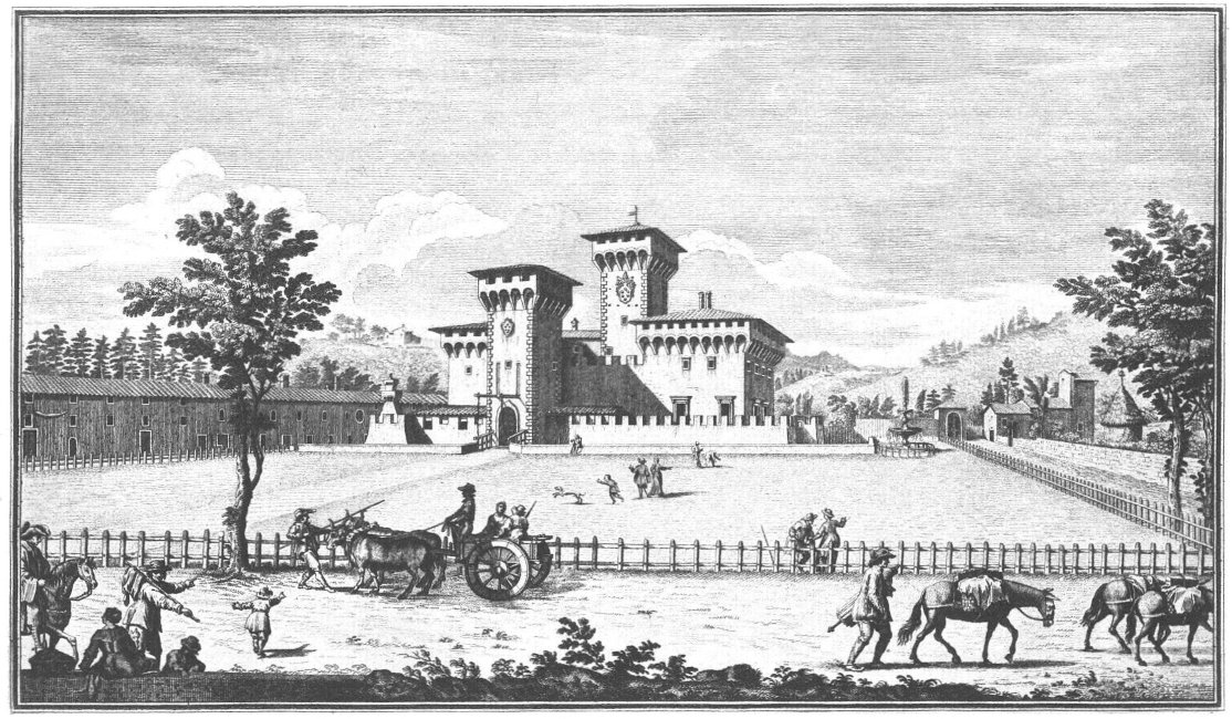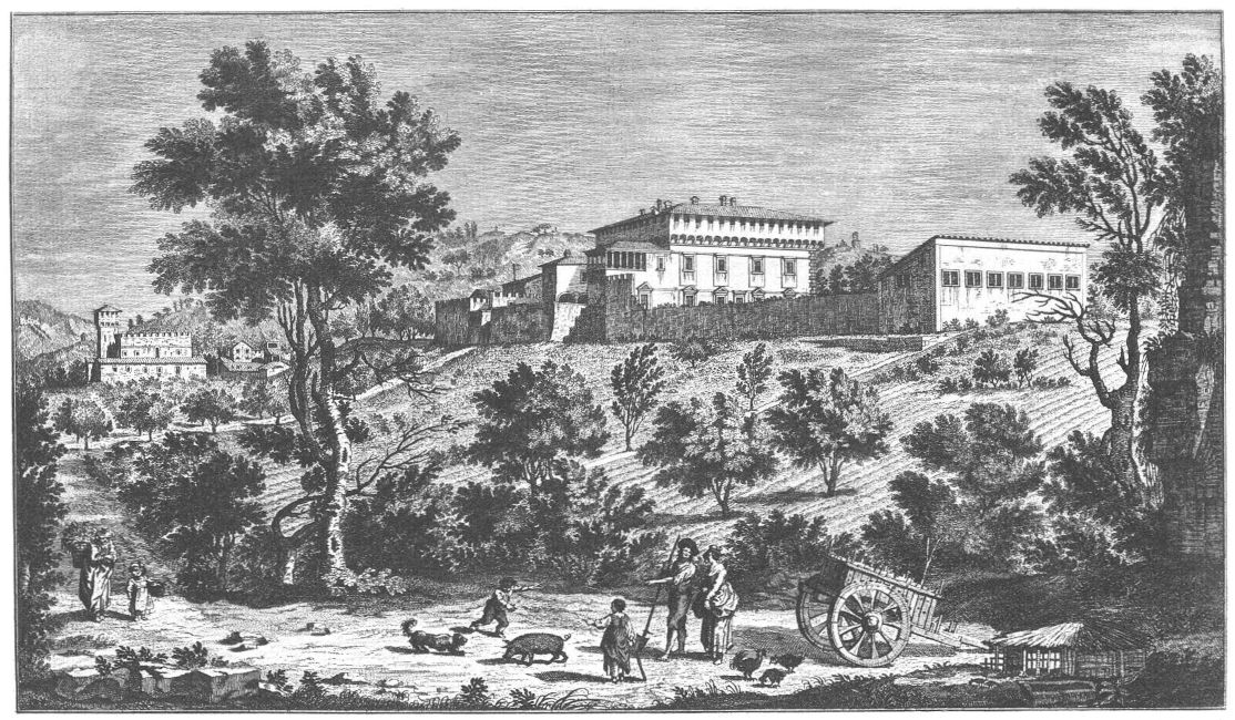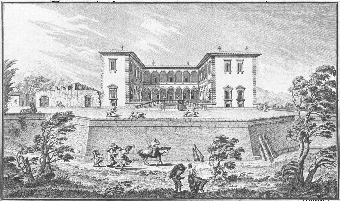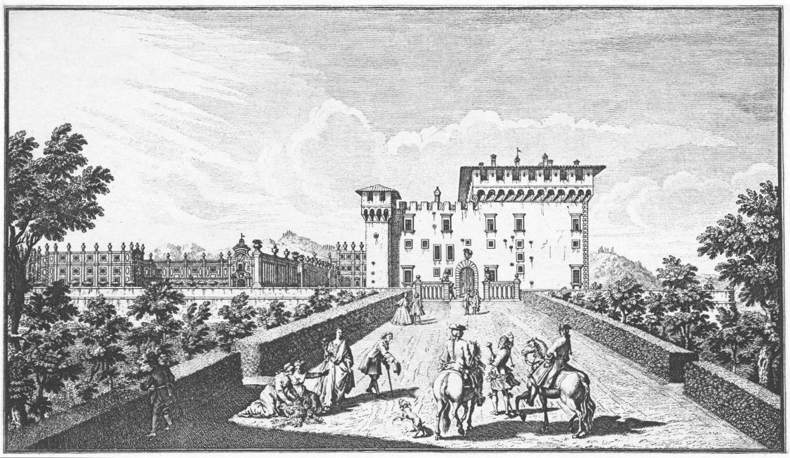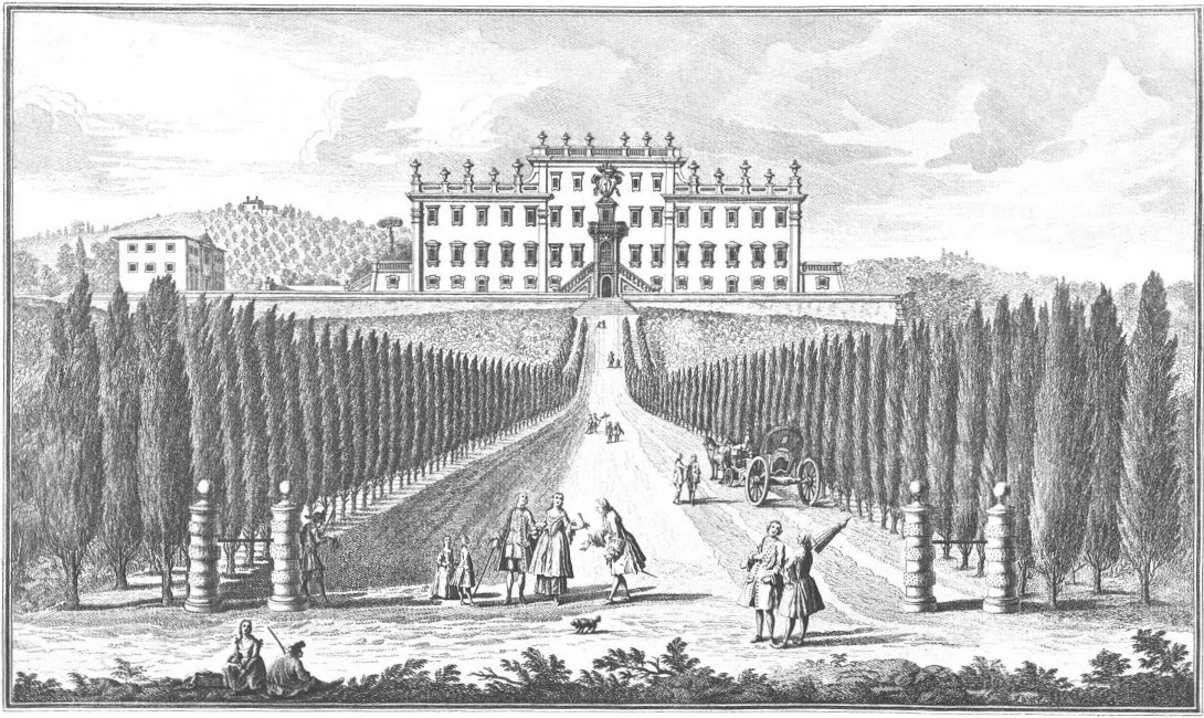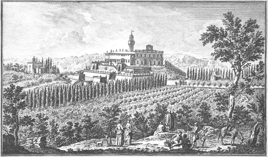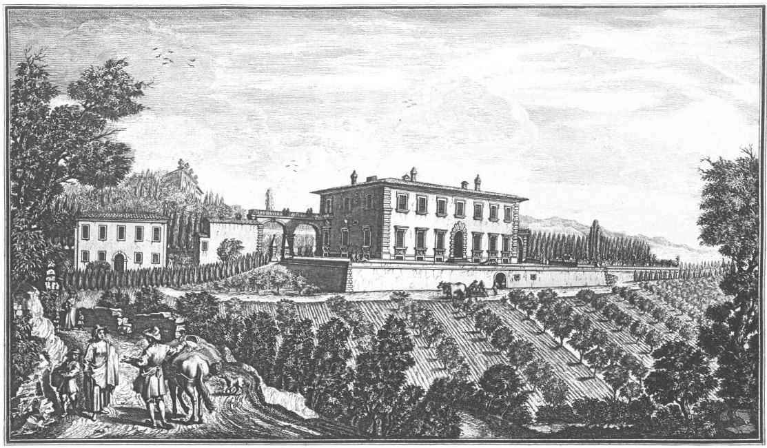Visitors to Florence are more or less intimately acquainted with the history of her churches, galleries and palaces, but there are few books dealing with the villas which crown the hills surrounding the lovely city. For years friends have asked me to write some account of them and the first beginning was made in an article in the National Review (May 1894) called “A stroll in Boccaccio’s country,” dealing chiefly with the two villas described by him in the Decameron in language of matchless grace and charm. Becoming interested in the subject I collected what information I could about the Florentine Villas and the families to whom they had belonged, and coming across Guiseppe Zocchi’s rare work Vedute delle Ville e d’altri luoghi della Toscana published in 1744, it was thought that reproductions of his beautiful etchings would enhance the interest of my book. Zocchi, about whom but little is known, was born near Florence in 1711 and died in 1767. Frescoes were executed by him in the Serristori and Rinuccini palaces and he was commissioned by the people of Siena to decorate their city with painted tapestries and hangings for a visit of Leopoldo, Grand Duke of Tuscany. This he probably owed to his patron the Marquis Gerini to whom the volume of engravings of the Villas was dedicated.