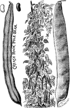 Pole Beans, as the name implies, require poles or some other support for the vines to twine upon. The poles must be set firmly, to prevent being blown over by the wind. Where poles are not procurable, the vines may be trained upon strings stretched up and down along two wires, which are stretched and firmly fastened to posts or stakes, one wire above and the other below. Pole Bean trellis, seven feet high, can be purchased, and will answer the purpose for which they are intended. The best pole bean of its kind is the Large White Lima. Being very tender, it should not be planted before the ground is warm. The beans will come up sooner if the eye in the seed is placed downward. The seed should be lightly covered with mellow soil, as this bean, considering its size, has less penetrating power in coming up than any other kind. In rainy seasons I have covered the seed with coffee grounds, which never became compact or hard[186] from the beating rains, and nearly every bean came up nicely, while those covered with earth were almost a total failure.[23] The Large White Lima is generally considered difficult to grow, but I cannot say so, as I have grown it without much difficulty, and had beans to perfection by the pailful throughout the summer. Mine were planted in very rich soil and the rows were about four feet apart, three plants to a hill, and the hills two feet apart. If supported by a trellis, beans should be placed one foot apart in the row. The above applies to all pole beans, whether Limas or string beans. Of the latter class of beans I have found White Creaseback a variety of great merit. Southern Prolific and Dutch Case Knife are also good. At the North, where the seasons are too short for the Large Lima, the Small Lima or Sieva, as it is also called, should be planted.