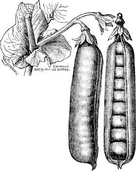 [9] Mr. Darlington’s remarks on the varieties of peas would be incomplete without reference to two remarkable new peas, obtained by crosses made some years since, but only now (1888) being introduced. These peas have been called Burpee’s Quantity (which is illustrated above), and Burpee’s Quality,—the former because it is the most productive of all, as many as ninety pods having been counted upon a single vine—the latter, because, while also very productive, it excels other varieties in its peculiarly rich, sugary flavor. Both varieties grow two and a half feet high, but will well repay brushing, and both are main-crop peas,—Burpee’s Quantity being ready for the table in about two months, and Burpee’s Quality in seven weeks from planting.