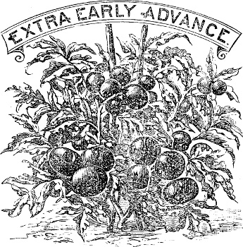 When all danger from frost is over, carefully transplant the Tomato plants from the cold frame to the open ground, to stand two feet apart in the row. As they grow tie them up on a trellis and remove all superfluous branches, so as to give the growing fruit the benefit of full sunshine, without which it will be of inferior quality and scarcely worth the having.[21] Nothing can be worse than allowing tomato plants to grow along the ground at will without any support. Better it would be not to grow any at all than to degrade them in that manner. Make a small trellis, four feet high, by nailing a few pieces of lath across small stakes driven into the ground. I regard Livingston’s Perfection as an excellent variety, and have grown extra large specimens of the Mikado, which, by the way, seems to have[185] been cast in the same mold as the Turner Hybrid.[22] Be this as it may, I can heartily recommend either variety to all wishing to grow fine, solid, enormous-sized tomatoes.