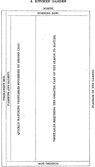 The accompanying plan may be of use to the novice in gardening on the scale suggested by our subject, as it is planned to admit of a proportionate quantity of such vegetables and fruits as are grown in the ordinary garden, while directions for planting and cultivating the various vegetables will be found in the special descriptions of the several varieties. (See p. 16.)