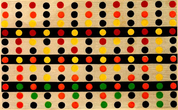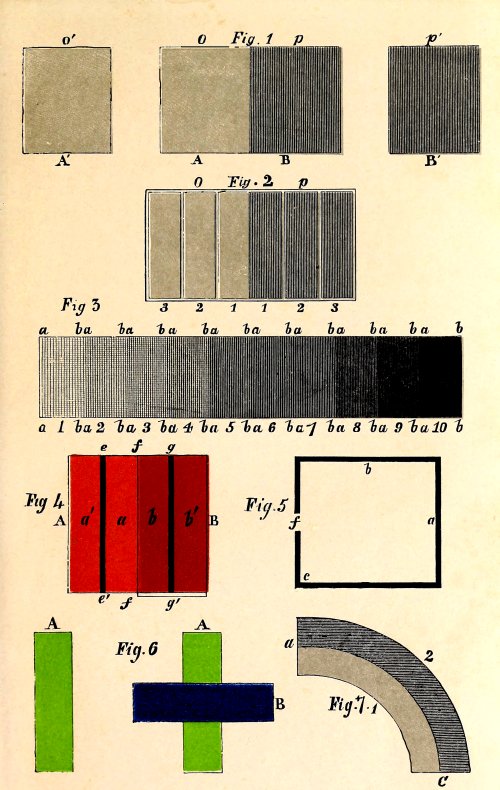 623. If we examine paintings with sufficiently powerful magnifiers, we shall see that the coloured material, far from being continuous in all [Pg 219] its parts, is in separate particles, and consequently, if the naked eye does not perceive them separately, it is because they are too small. In fact, the coloured threads (elements of tapestries and carpets), and rigid coloured prisms (elements of mosaics), which are visible to the naked eye, may be reduced to such a state of division, and so mixed and combined, that at the distance from which we view them united they appear as a uniform coloured surface—as if painted; whence the possibility of making, with these elements, works which correspond to those painted in chiaro-’scuro; but it will be easier to execute such as correspond with flat tints.