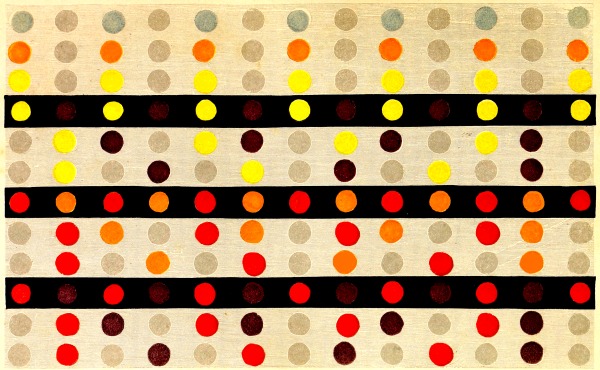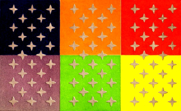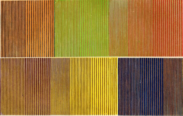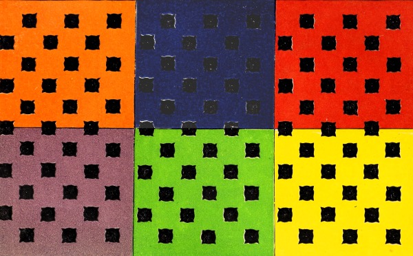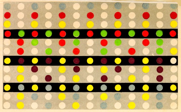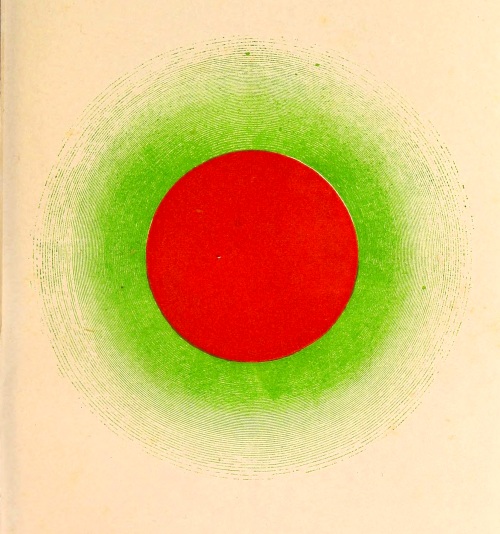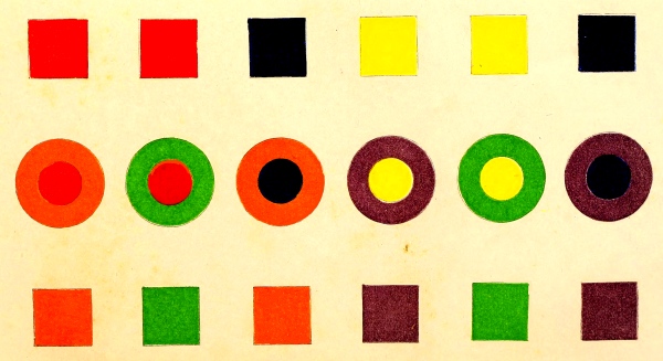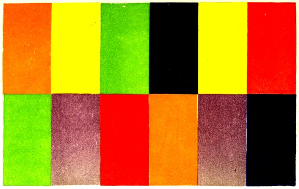 [1] In the original French Edition there is evidently a confusion of terms in this and the two following articles (39, 40, 41, 42). The Red is there represented as placed in juxtaposition with red, and green with green, and so on with the other instances; orange and blue; orange-yellow and indigo; greenish-yellow and violet; instead of being made by contrast with their respective complementaries to intensify each other.
