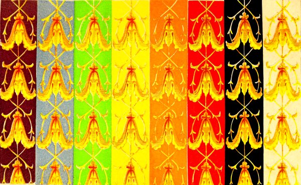 It is quite otherwise with patterns of tapestry for furniture. I believe that we can make some very beautiful works by copying patterns in flat tints; and that, in the decoration of large apartments, we may obtain an excellent effect from this kind of tapestry. I believe, also, that it would be more suitable for forming part of a general system of decoration, than the kind of tapestry of which I have spoken in the preceding article. Moreover, it is more favourable than the latter to the splendour of the colours.