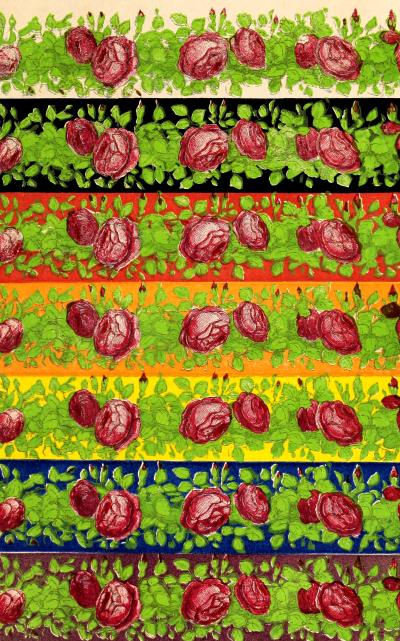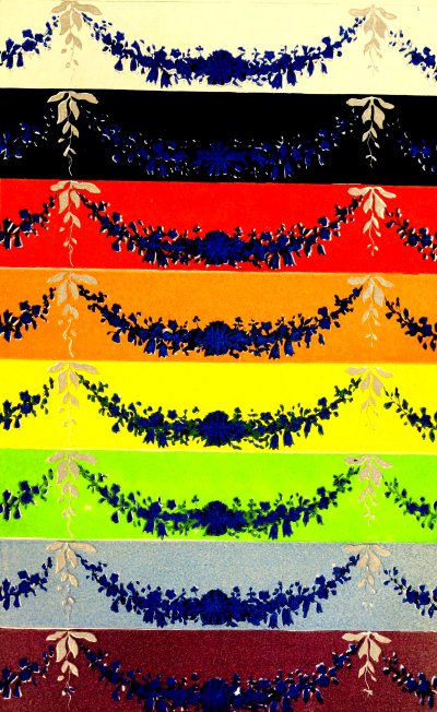 From among the facts I could quote to support this opinion, I shall select the following. There was a deep rose-red curtain, the centre representing a large bouquet of flowers of various colours, framed, as it were, in a garland of white roses. The artist had painted the model under the idea of executing this garland with silver thread; but this metal being objectionable, on account of its tarnishing by various exhalations, preference was given to white and grey silk, imitating the tones yielded by a silver object in relief. An experiment showed that it could not be attained by these means, because the contrast of the ground made all the half-tints appear green-grey, and these in their turn made the lights appear rusty-pink, in consequence of the greenish colour of their contrast. This annoyance being communicated to me, I advised M. Deyrolle, in reproducing the model, to make use of only three light tones of the rose scale in silk, and a white linen thread. By this means I expected that the complementary of the ground, neutralizing the rose, would produce a greyish half-tint, well adapted to set off the white. The result was such as I had foreseen. A second copy, made with a mixture of the light tones of the pure rose scale, slightly broken, gave an image less white, less silvery than the [Pg 222] preceding; or, in other terms, appearing a little greenish when compared with the first, and more harmonious. It resembled the effect obtained with rose-red under lace or tulle, which permits little of the ground to be seen. This example indicates the means of executing white designs upon any kind of ground.