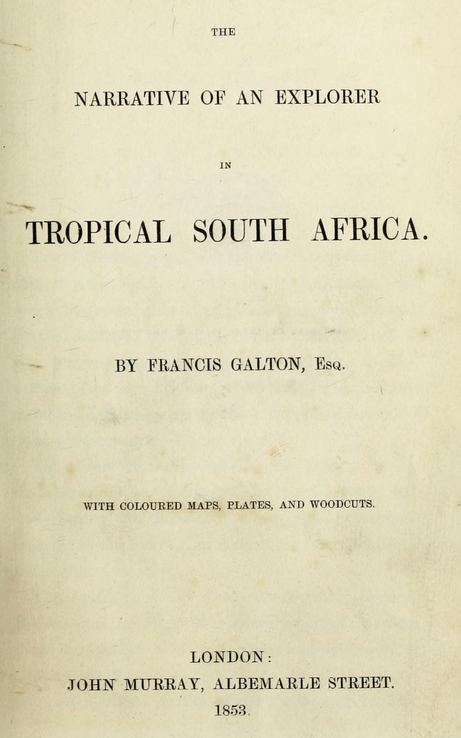 NARRATIVE OF AN EXPLORER IN TROPICAL SOUTH AFRICA. By FRANCIS GALTON, Esq. With Maps and Plates. Post 8vo.