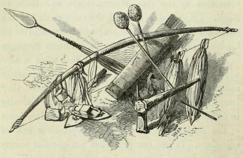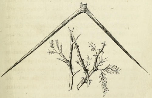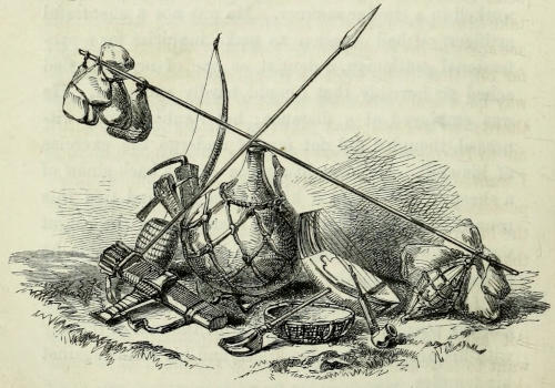 The Bushmen of ’Tounobis are far superior to the Damaras in the art of catching animals; their springe is a very simple one. I admired the simplicity of the method by which the antelopes were induced to leap into the middle of it; an unpractised hand would have made a fence as though he were laying out a steeple-chase course, but the Bushmen simply bend a twig across the pathway, which does not in the least frighten the animal, but which, in the gaiety of his [285]heart, he overleaps. The pitfalls are neatly made; there is, however, nothing in them which an English gamekeeper would not contrive as well.