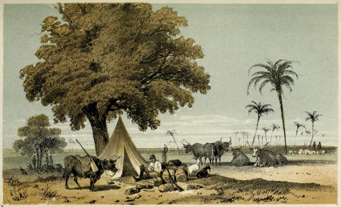 The Bushmen assured me that the character of the country between that place and the lake was of exactly the same description as that around us, a sandy soil with not unfrequent dried-up vleys, and [282]covered with trees, but by no means so thickly as to impede the progress of a waggon.