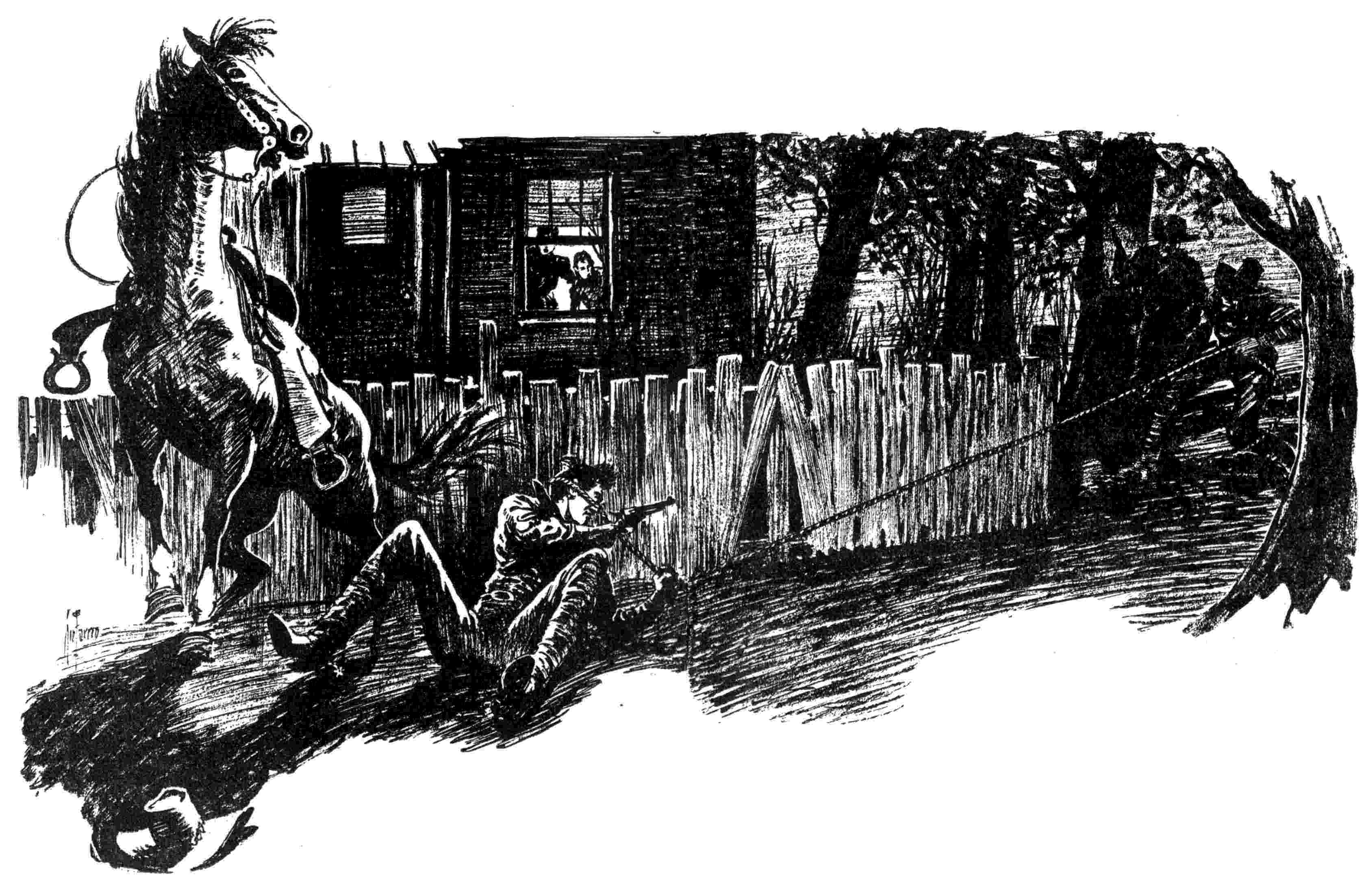 There was no chance to get through that milling crowd. Skeeter Bill whirled to the front windows. They were not built to be opened, but Skeeter hurled a chair through one of them, and went out onto the sidewalk as Slim Lacey ran from the entrance. The gambler saw Skeeter Bill, whirled, gun in hand, but caught his heel and went flat on his back, firing one shot straight into the air, before Skeeter’s toe caught the gun and kicked it halfway across the street.