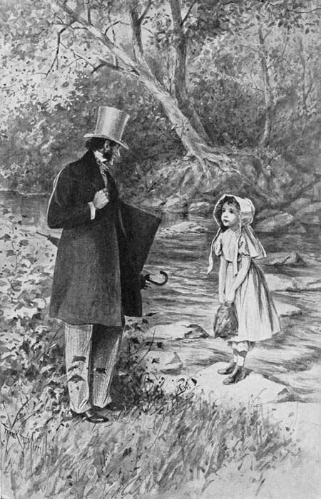 “Good-morning, little girl,” said a winning voice; and the little girl jumped up, reeled, set one foot in the water, and brandished her reticule in the effort to regain her balance. The sugared butter-bread and sweet cookies tumbled against currant-pie and cherries, and all [11]settled to an upside-down condition as she finally got on the bank and saw a gentleman preparing to trip across the stones.