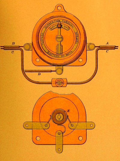 The circuit-closer consists of a cylindrical brass casting, having one end closed, and on this end are four feet by which it is secured to the lower head of the service torpedo by screws. The cylinder, 4¾ inches long and 5 inches in diameter, is closed at the open end by a screw-cover, having four lugs that serve as bearings for the contact-arms; these arms, four in number, work in slots cut in a plunger that passes through the center of the cap, and they are held in place by screws through the ends of two arms and their lugs. Inside the cylinder are two insulated contact-springs secured to binding-posts in an ebonite collar. This collar screws on the end of a short brass tube that carries a plunger tipped on the inner end with ebonite. A stout spiral spring in the tube through which passes this plunger, maintains, normally, the end of the plunger clear of the contact-springs. A rubber diaphragm separates the plunger in the cover from the plunger in the tube, and also acts as a washer to the cover, making the cylinder water-tight; a brass washer, laid on this diaphragm, acts as a friction-plate for the cover to turn on when screwed up. A safety-pin [Pg 5] through the outer plunger prevents its being forced in accidentally. When this pin is withdrawn, any pressure on the contact-arms tends to force the inner plunger in against the action of the spiral spring and to close the break between the contact-springs.