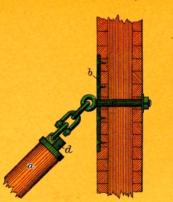 These are iron pipes, 8 feet long. Those for ships‘ use have a slot cut in one end, for a key. Those for use in boats are fitted at one end with an iron disc, called a butt, and at 2 feet 2 inches from the butt an iron cap is riveted to the spar. All secondary spars have, at 5 inches from the outer end, a hole for the torpedo-pin. Secondary spars are packed six in a box; those for ships having a key stopped to each to be used in securing the secondary spar to the inner spar-band; those for boats having a toggle stopped to each to be used in securing the secondary spar to the boat spar.