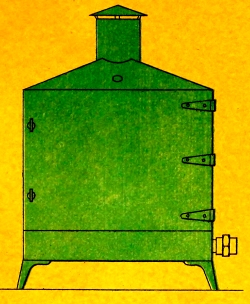 The primer-case, 8⅛ inches long and 3 inches square, inside measurement, is made of tin coated inside and out with shellac and is closed at one end.