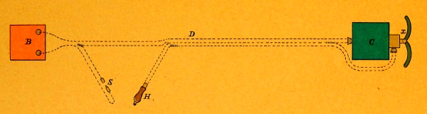 This contains 300 feet of insulated double-conductor wire cable. The inner ends of the cable are connected to binding-screws on the sides of the reel, where short wires are to be attached, for making connections with batteries, etc., after the requisite amount of cable has been unreeled. A handle is becketed to the cover of the box, to be used in reeling up the cable. The binding-screws must be kept free from rust (no oil to be used in cleaning), and must be occasionally turned to keep them from setting.