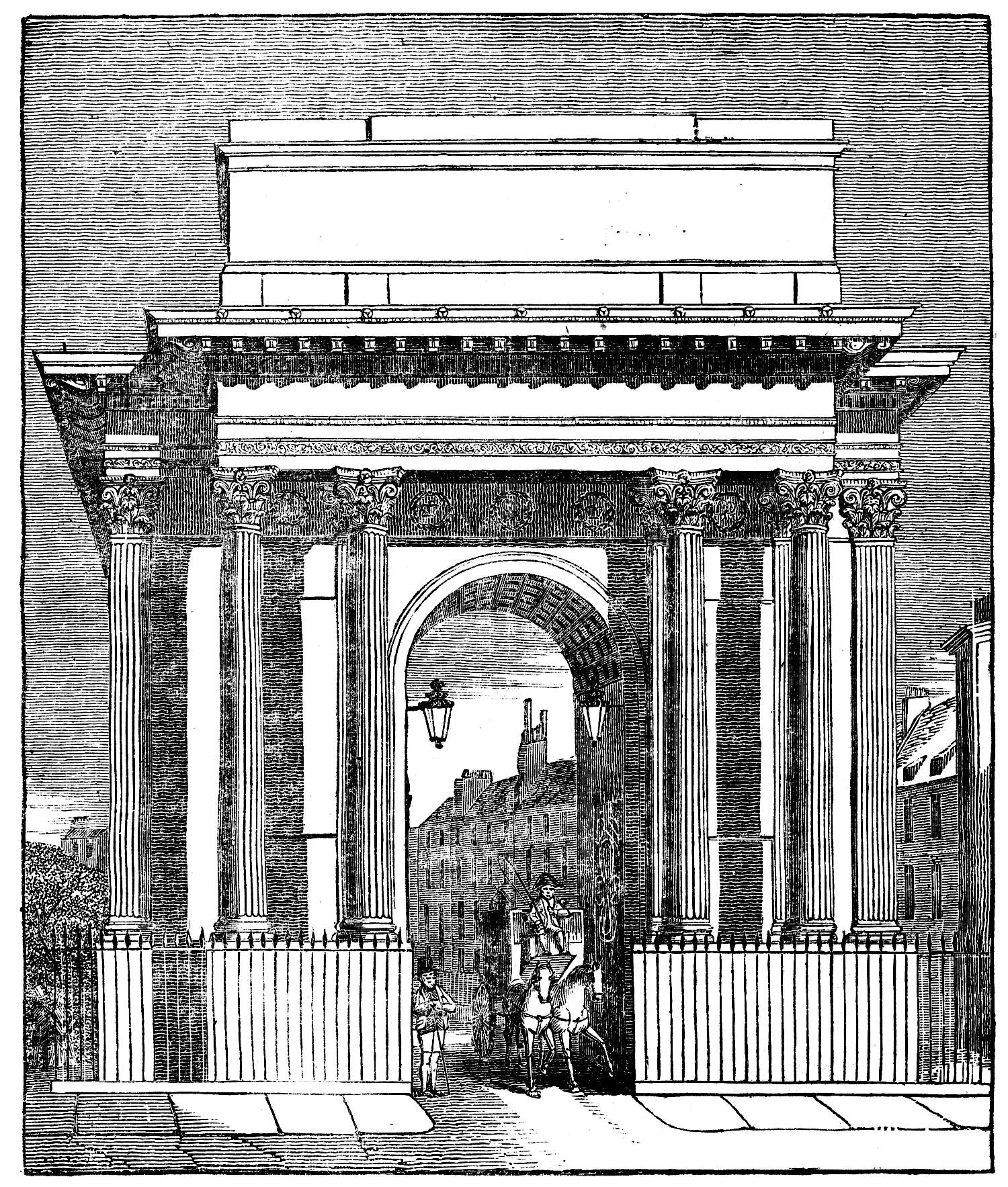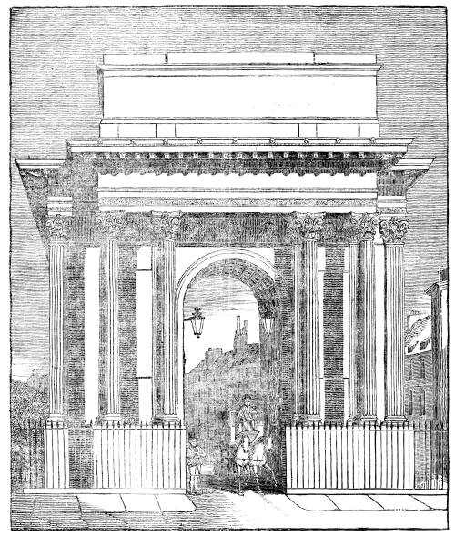 This fine gate, which was completed about five years since, after a design by Mr. Decimus Burton, was originally intended for a private entrance to the New Palace. Within the last few months it has been devoted to a purpose of more general utility, the road from Constitution Hill having been turned so as to allow access through the gate to those carriages which have the privilege of passing through the park, and also to foot-passengers. A new lodge has recently been erected in James Street, opening to the road connecting Pimlico with Great George Street, Westminster; and this road is free to horsemen and private carriages without distinction.