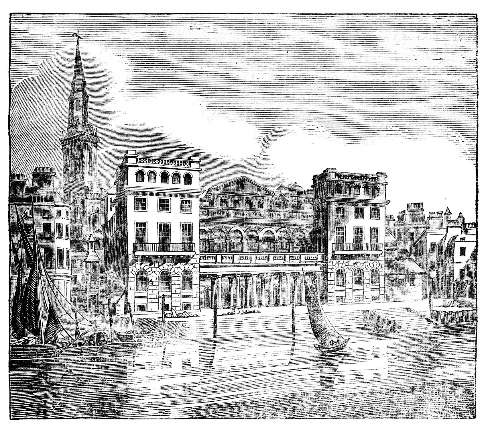 An act was obtained in 1830, incorporating a company of proprietors for the re-establishment of Hungerford Market. The site of the old market has been purchased, together with the surrounding houses, those in Hungerford-street, and some few in the Strand, in order to ensure a proper frontage and secure a convenient access to that thoroughfare. Many of these buildings are pulled down. The architect of the New Market is Mr. C. Fowler. The front to the river is completed externally, and forms a very elegant structure, as represented in the above view. The basement of the centre next the river constitutes the Fish-Market. The wings are intended for taverns, connected by a colonnade with a terrace which occupies the entire front. From the Fish-Market the ascent is by a spacious flight of steps in the centre externally, and two staircases within, at the extremities of the portico, which is separated from the hall by a screen of arches. The hall, exclusive of the porticoes, is 157 feet long by 123 feet wide, consisting of a nave and two aisles, besides ranges of shops against the side walls, with galleries over. These galleries are approached by four staircases at the extremities. The floor of the hall will be occupied by ranges of stands for casual business, with convenient avenues between them. The galleries will be appropriated for the sale of such articles as require a neat display, and will be disposed somewhat in the manner of a bazaar, with a range of counters, &c., and a walk in front. The roof of the nave, or centre compartment of the building, being raised above the other parts by a tier of open arches, ensures an ample supply of light and air; the roofs of the aisles are likewise open in the centre, in order still further to secure that important object. Underneath the whole of the hall is a range of arched cellars or vaults, having approaches in various directions. The upper court corresponds nearly with the lower court or Fish-Market, but at the level of a story above it. The colonnades are here combined with shops and dwellings for resident shopkeepers. The columns, stairs, pavement, and parts of the front of this important building are of granite.
